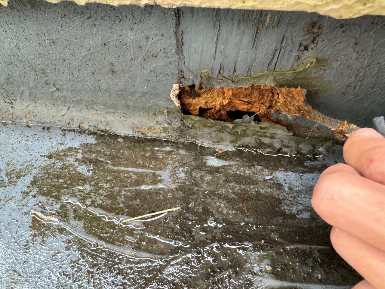 バルコニーはこれだけ長いのに水が流れる箇所のドレンは一か所しかついていませんでした、常に水が溜まっている状態で状況は悪いです