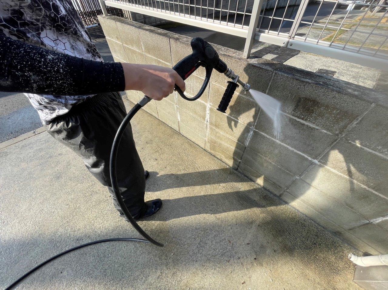 高圧洗浄状況です。塀と駐車場のコンクリートをきれいにしました。