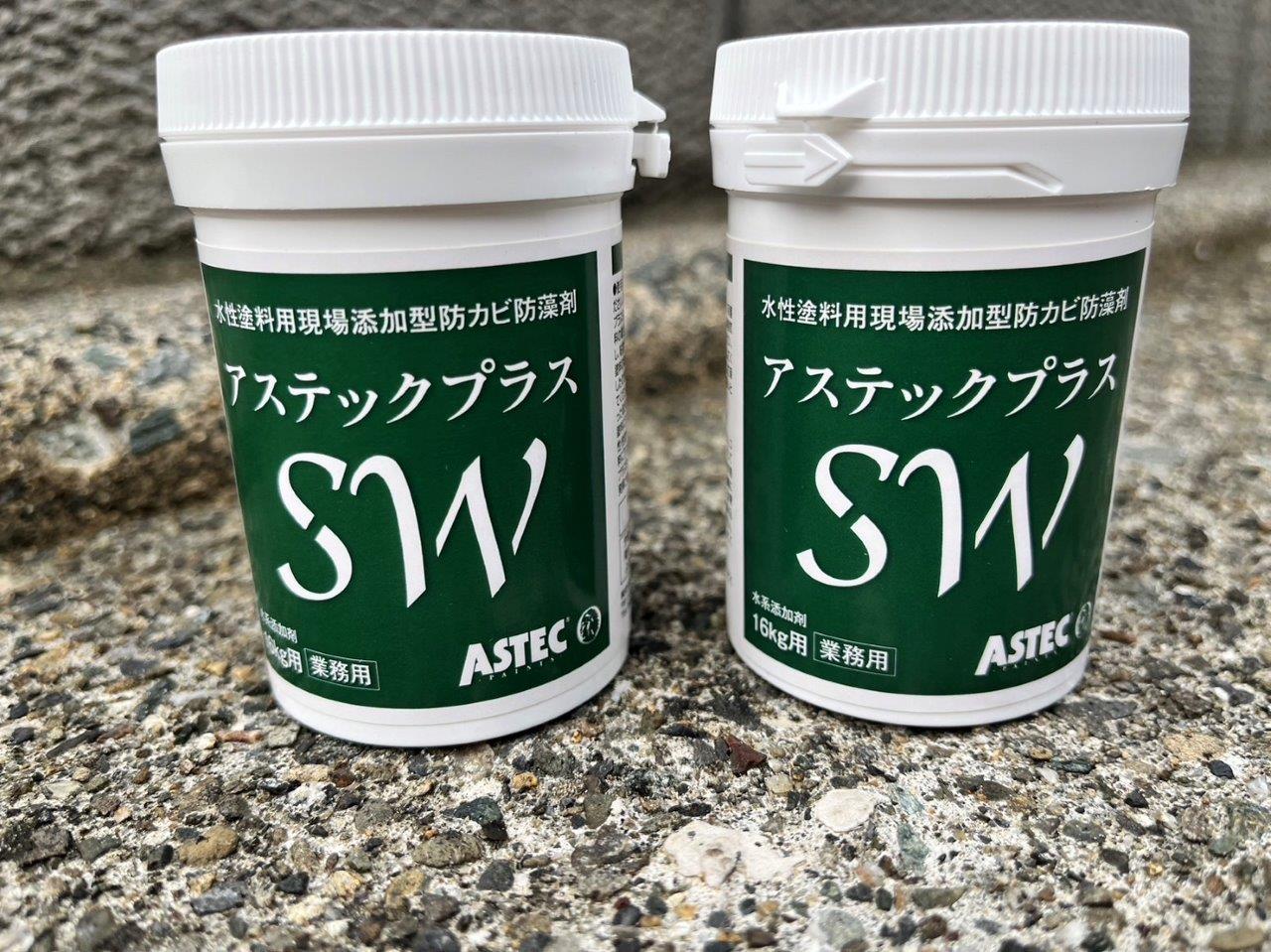アステックの塗料に防カビ材を添加します、施主様が軒天のカビの発生を気にされていましたのでご提案いたしました。