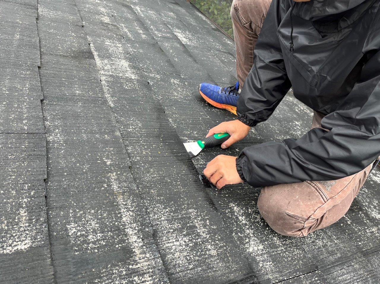 屋根はスレートなんですが、あまりにも重なり目がくっつきすぎているのでタスペーサーを挿入します。理由としては毛細管現象をふせぐためです。