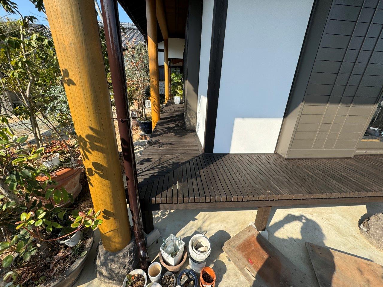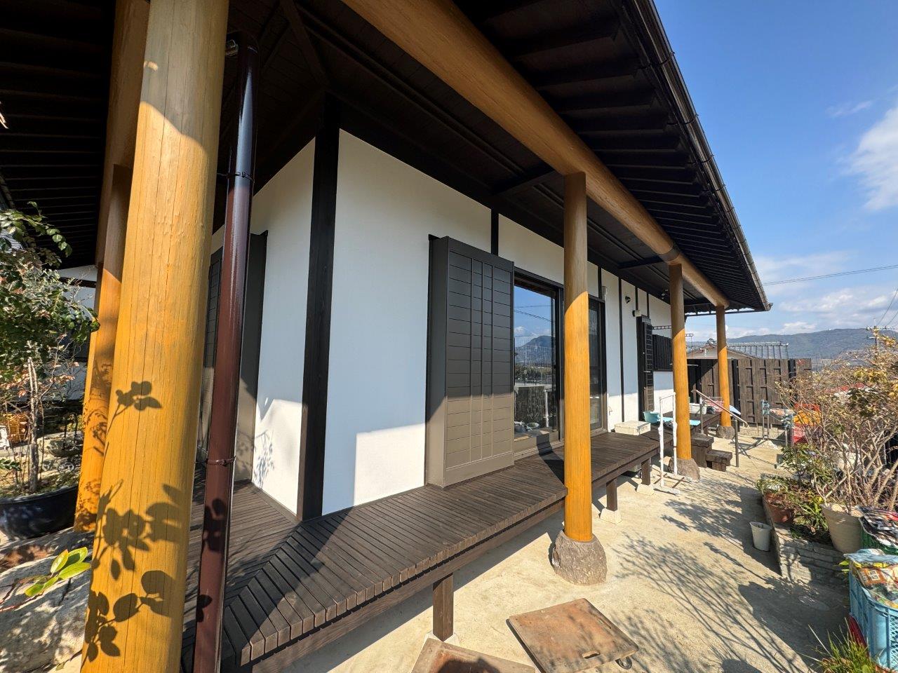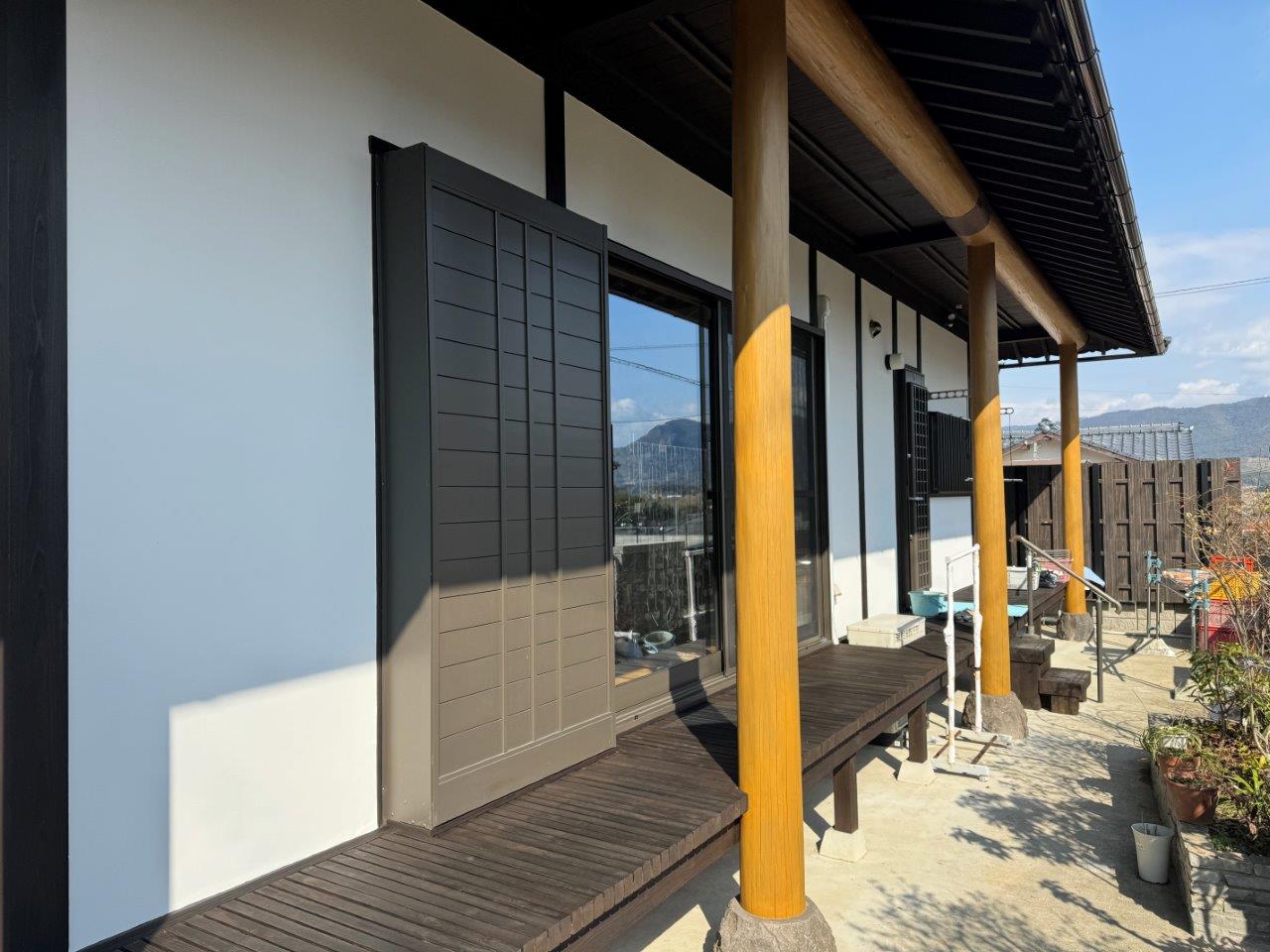 玄関まわりのお写真です。玄関の木部は透明の塗装をしております。丸柱は浸透性系の塗料では色がでなかったので、半造膜のガードラックアクアで施工しました。