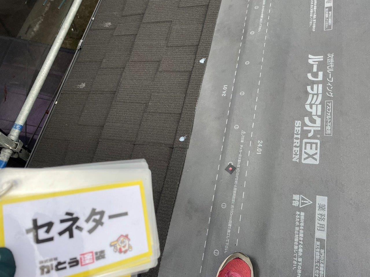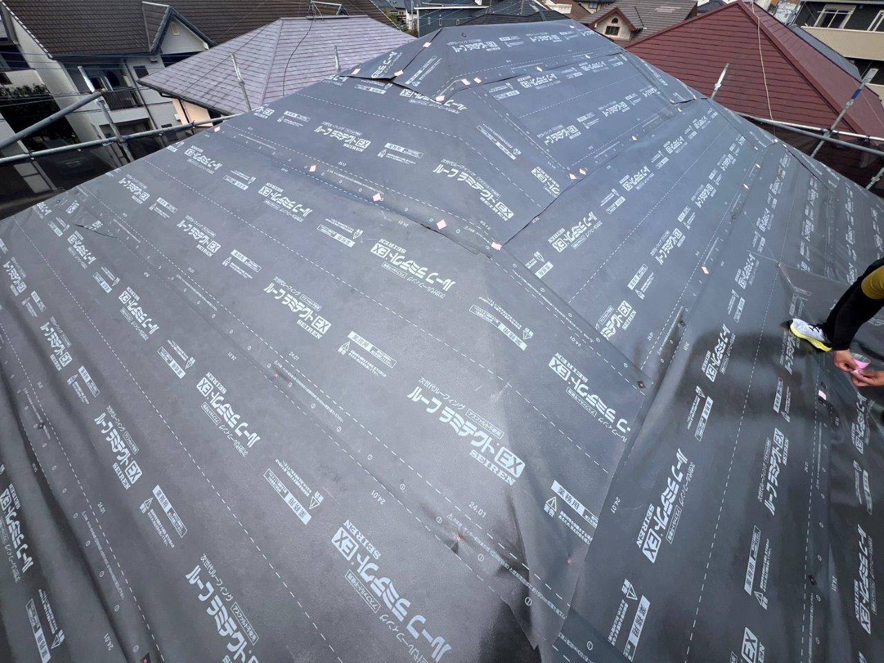 カバー工法ですので既存の屋根の上にこのようにルーフィングをはります。