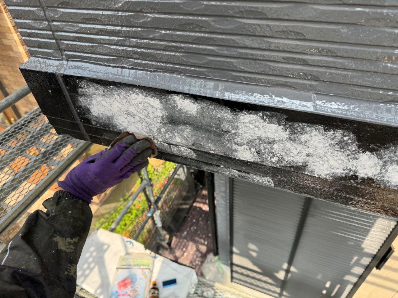 幕板の上部からコーキングが劣化して雨水が入水していましたので、今回はコーキングをへら押えするさいに斜めにして雨水が上部に溜まらないようにしています。
