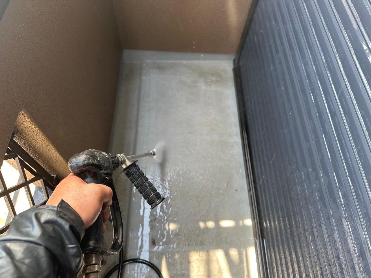 バルコニーの床の高圧洗浄状況です。今回、防水塗装をいたします。