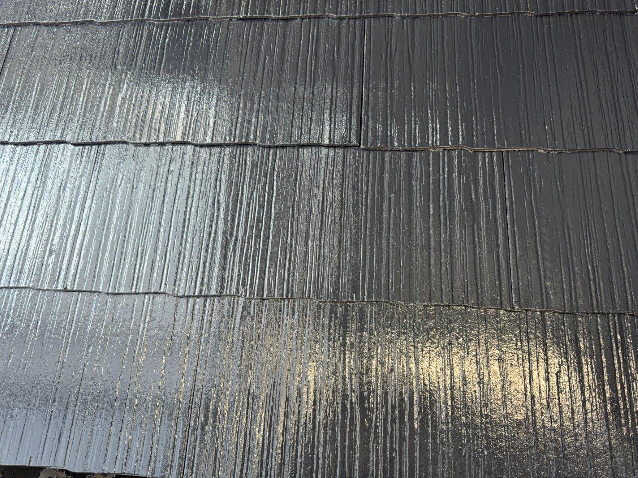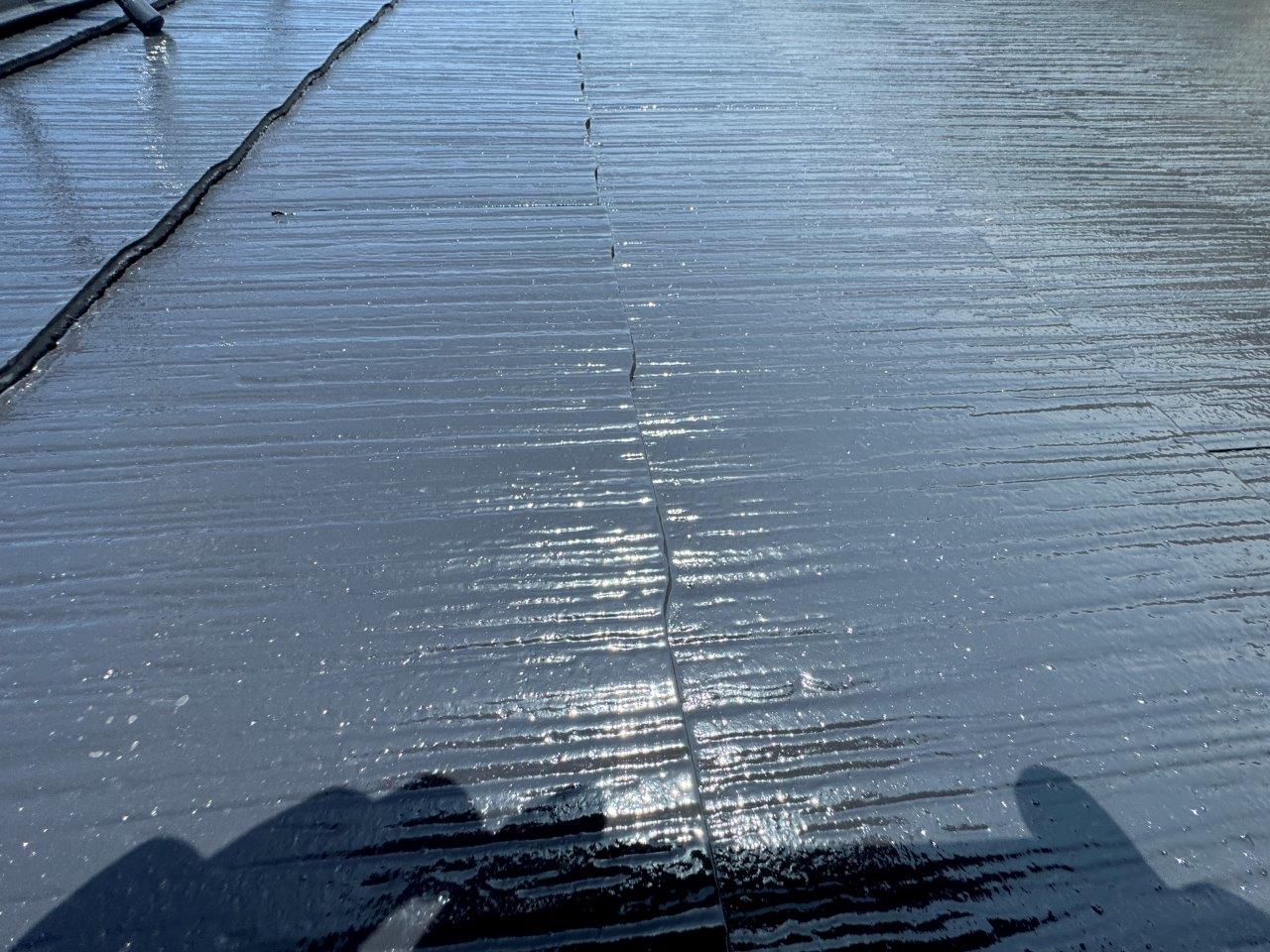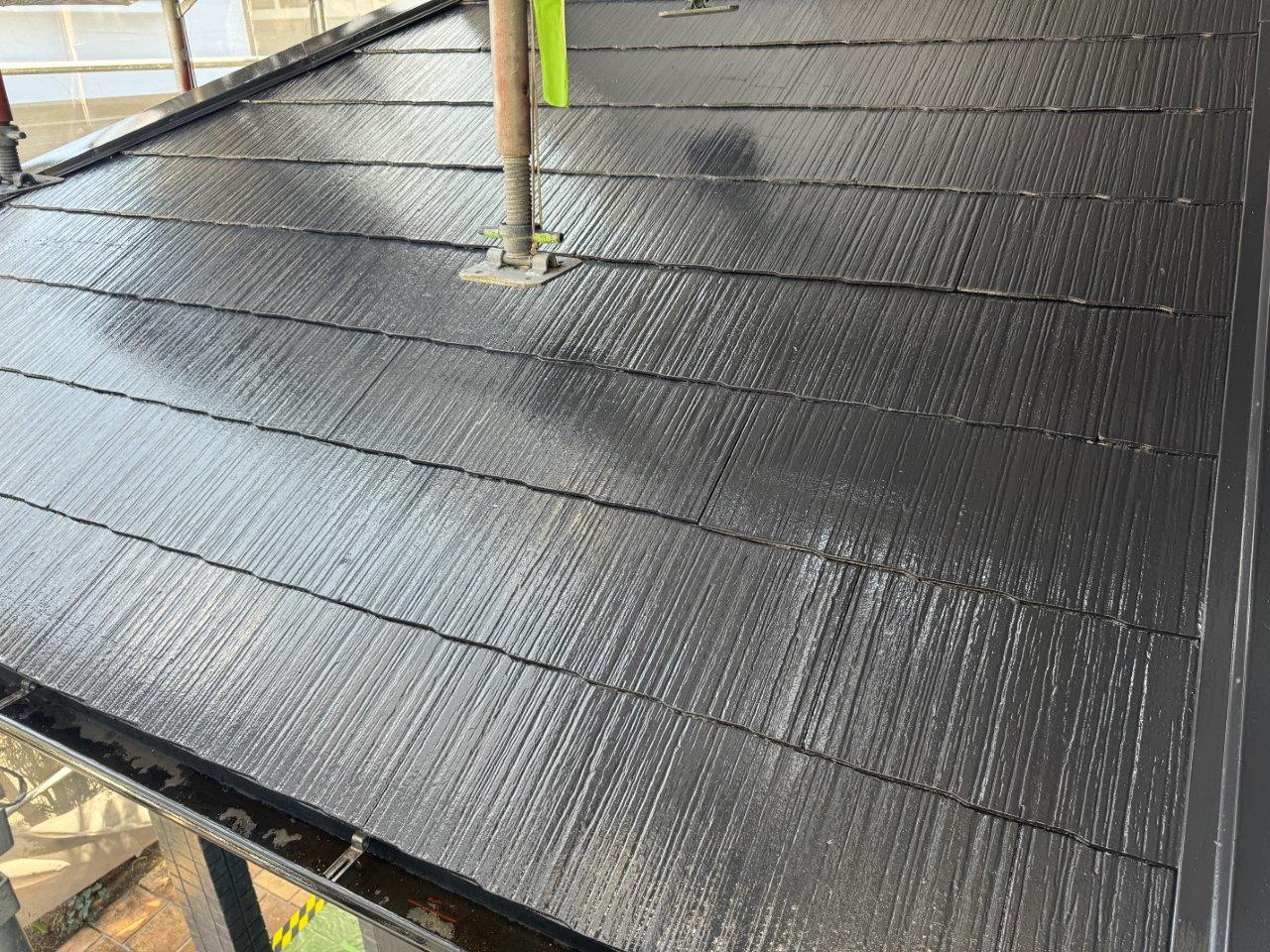 屋根の上塗り状況です、艶っ艶になりました撥水もバッチリききそうです。