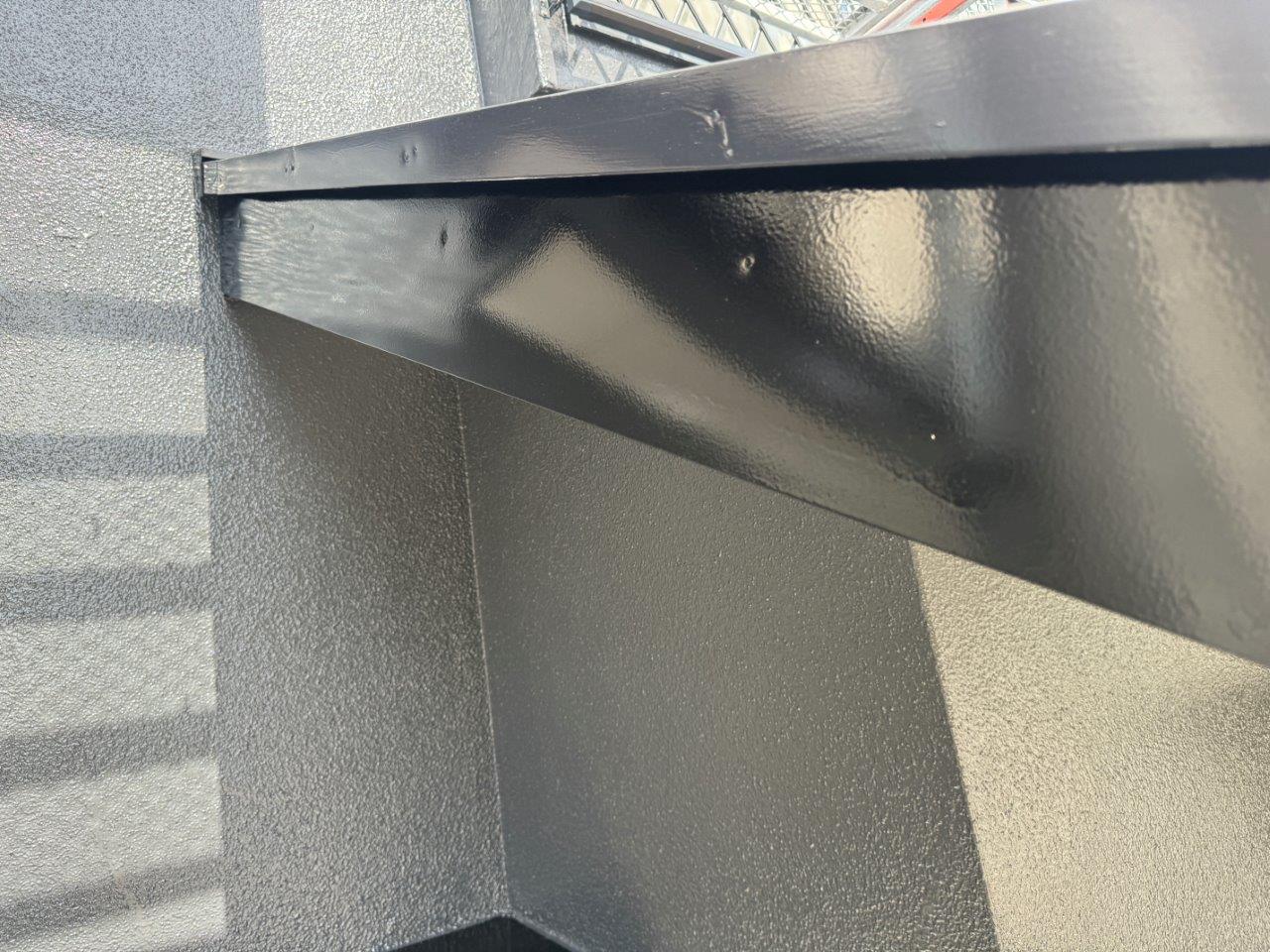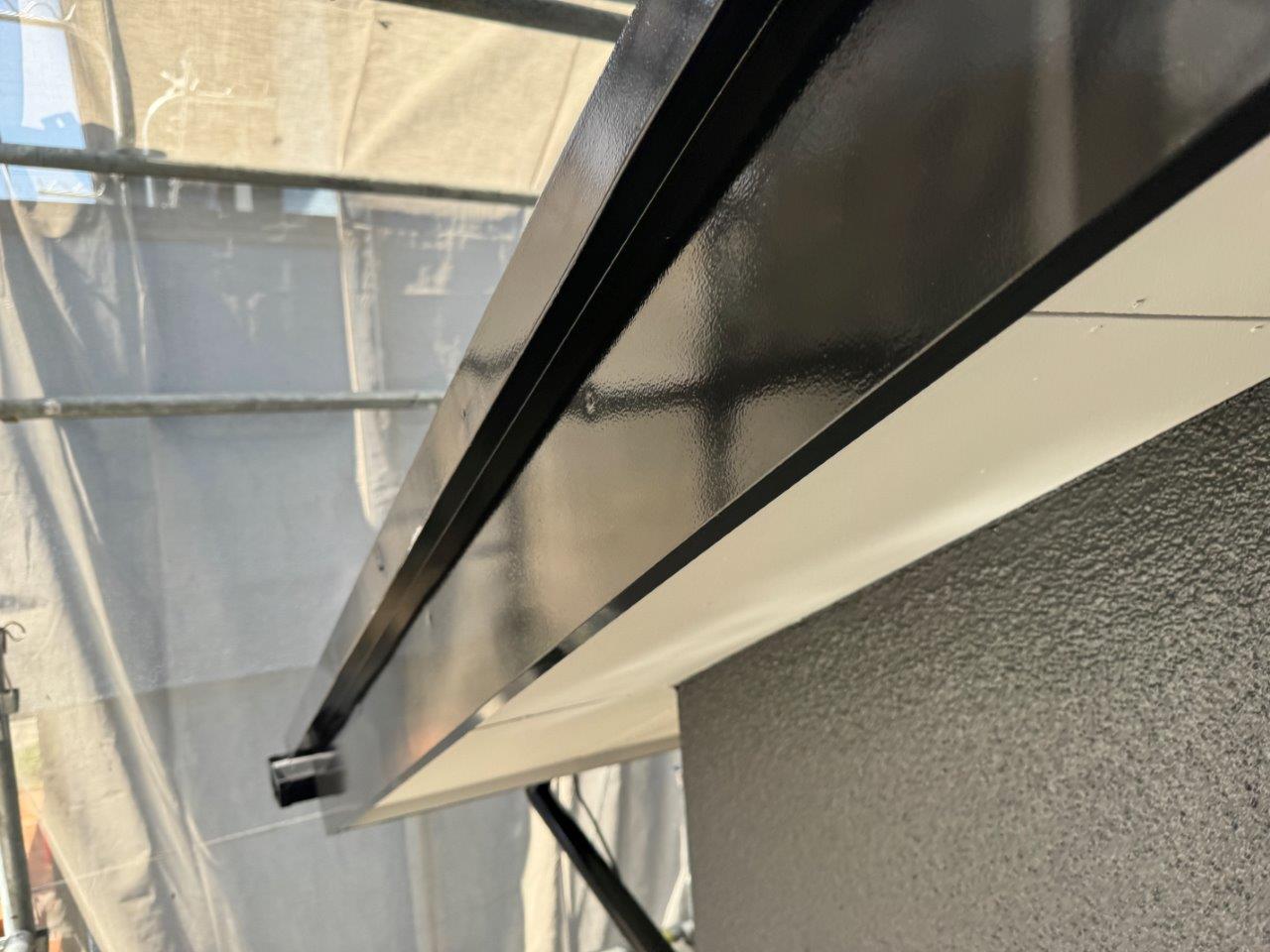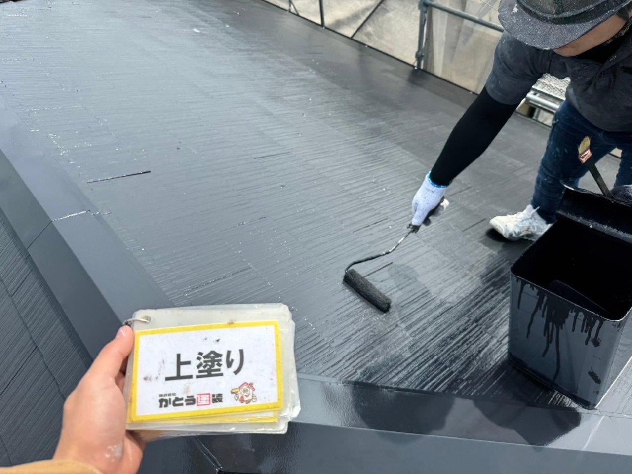 屋根の上塗り状況です、艶っ艶になりました撥水もバッチリききそうです。