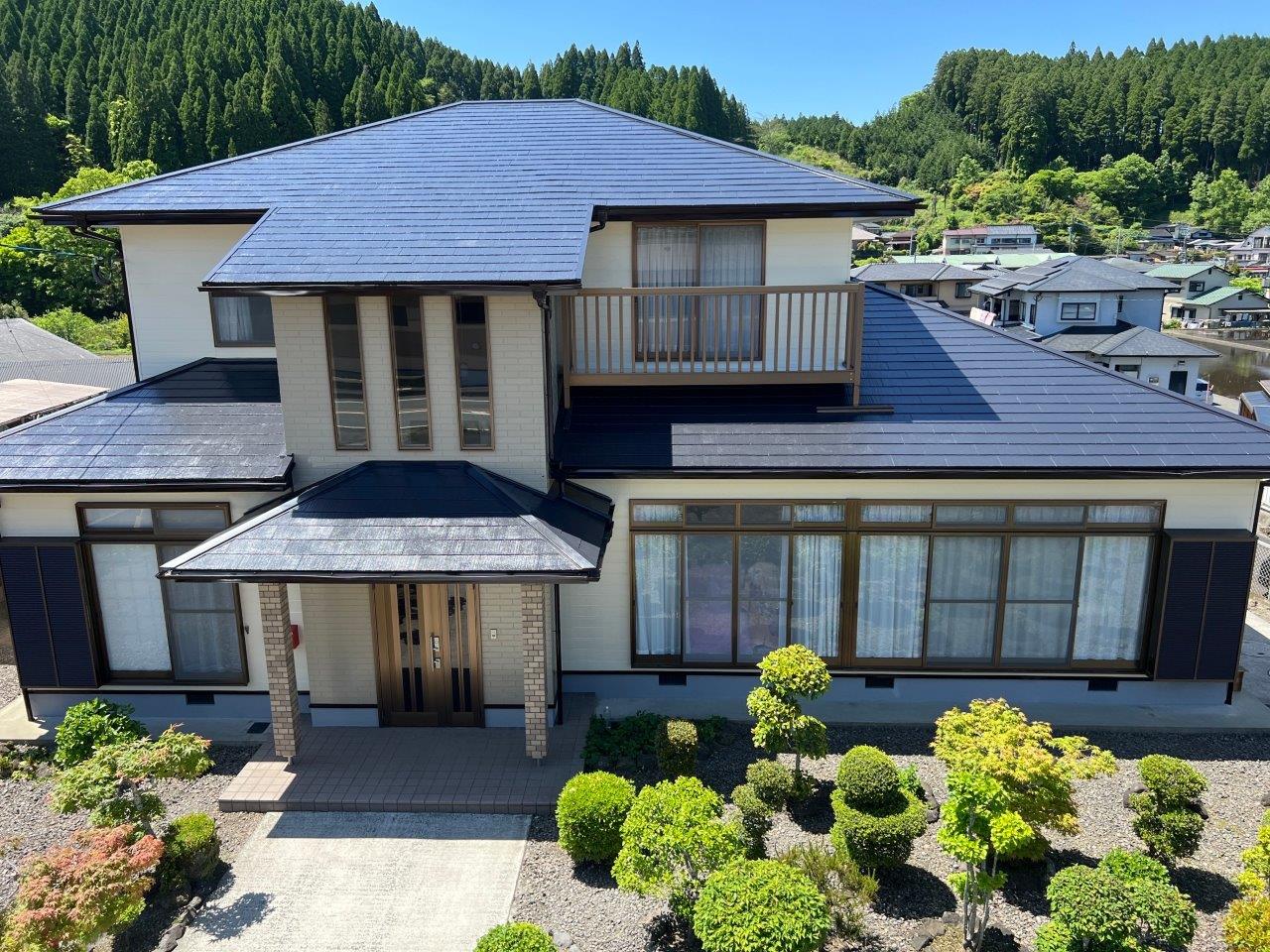 施工後のお写真です、お家が大きく要望としては長持ちさせてもらいたいとのことでしたので、高耐久のある塗料を外壁・屋根ともに使用しています屋根は4回塗りで仕上げ外壁は玄関まわりのサイディングボードは色分けして仕上げました。