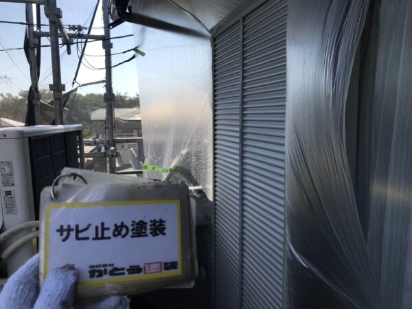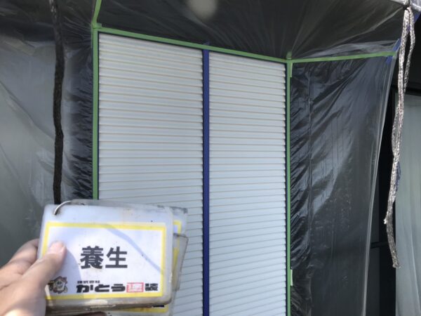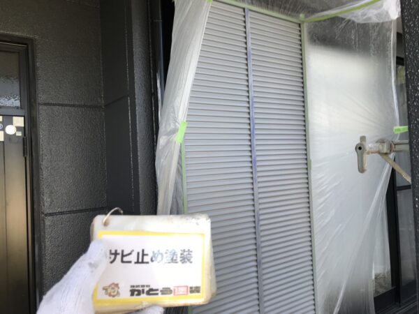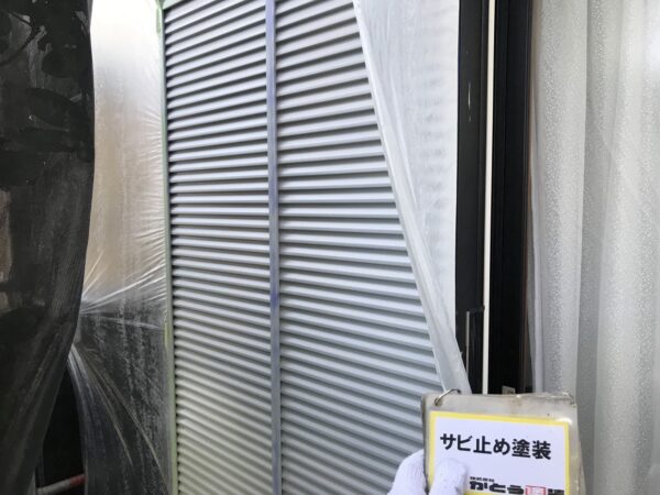 合志市T様邸外壁塗装,雨戸の養生,サビ止め塗装をおこないました