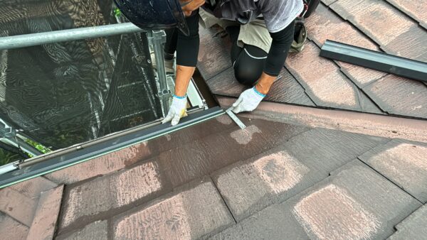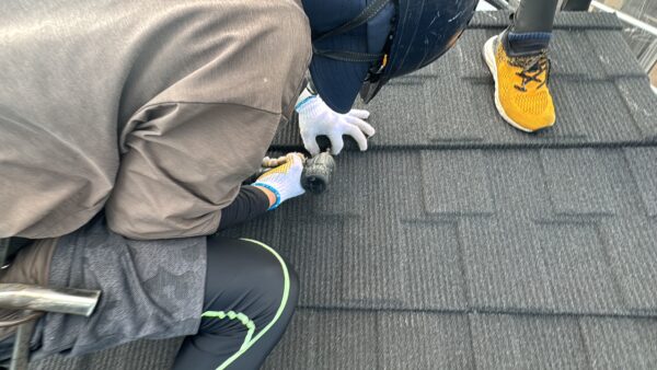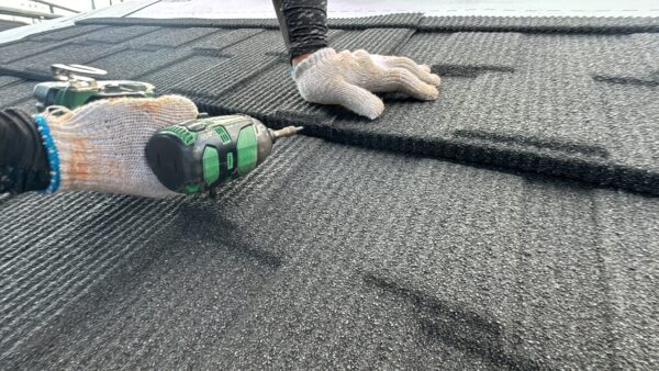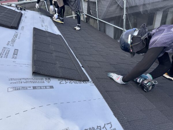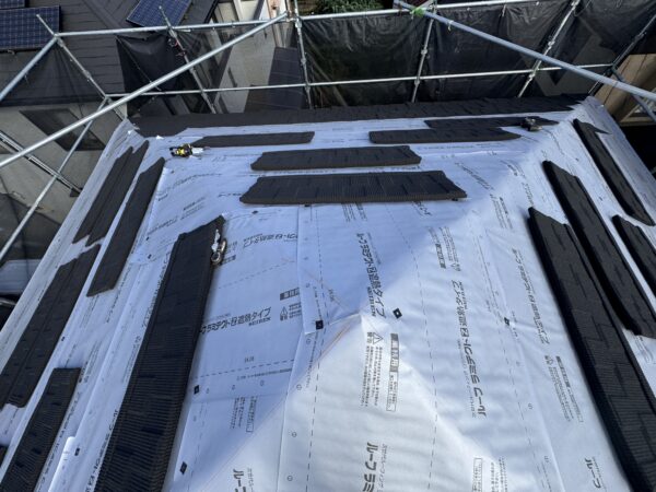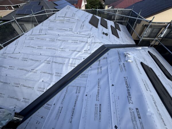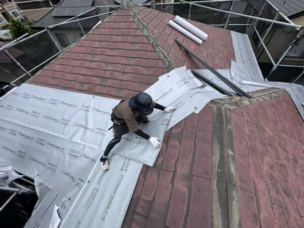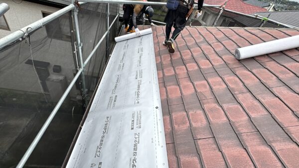 既存の屋根の上からルーフィング(防水シート)を貼りつけます。