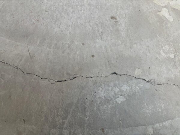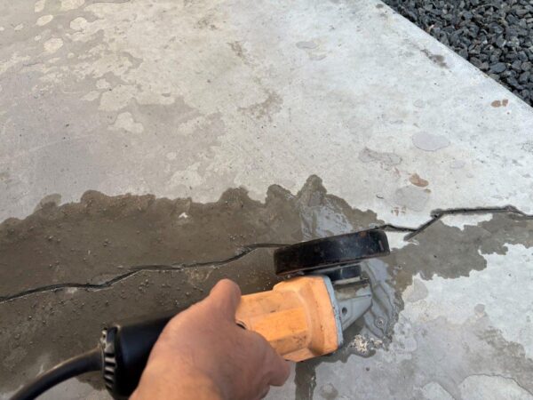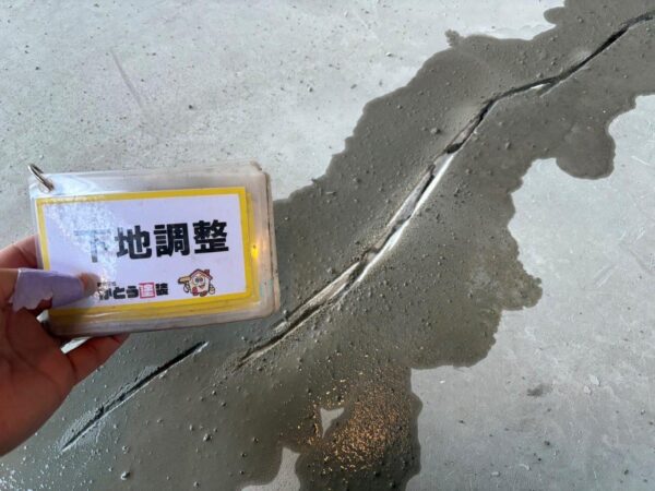 1F部分の土間コンクリートの塗装をおこないます、ひび割れがはいっていて深いのと幅があるのでVカット補修してから施工にはいります、塗装するまえに下処理をおこないます
