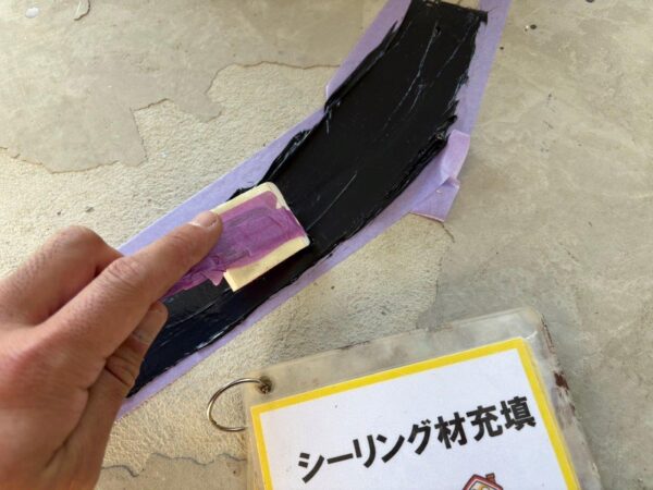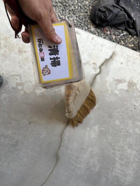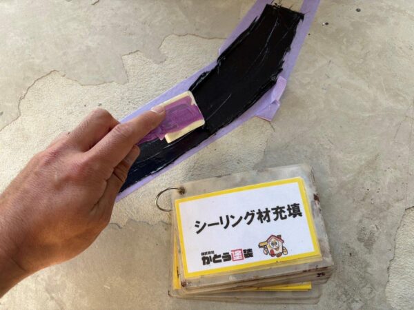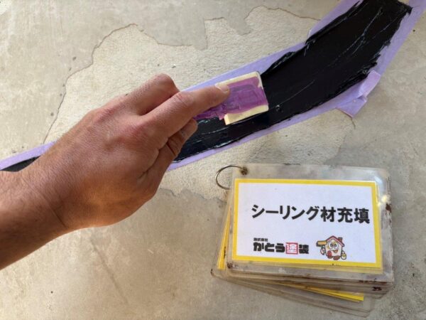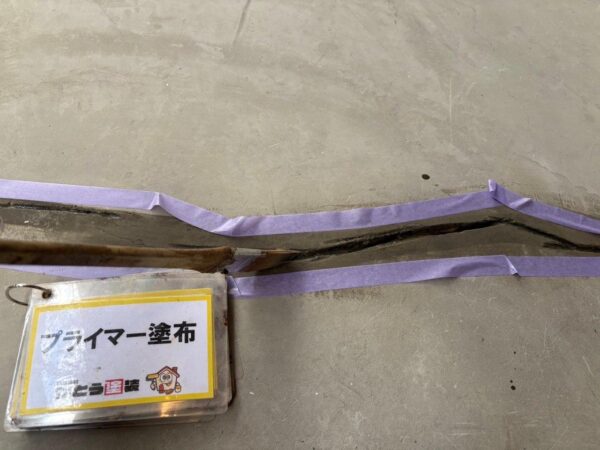 Vカットしてプライマーを塗布します、セメントの成分を固めないとコーキングがくいつかないためです、