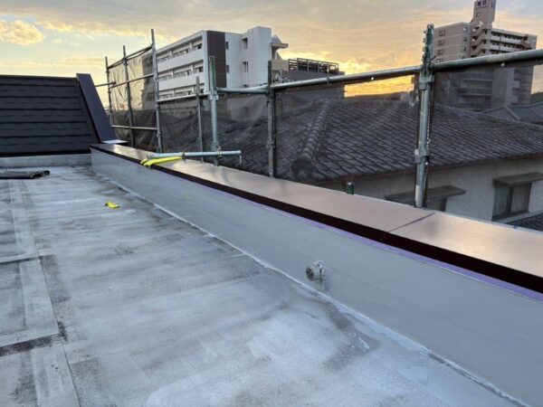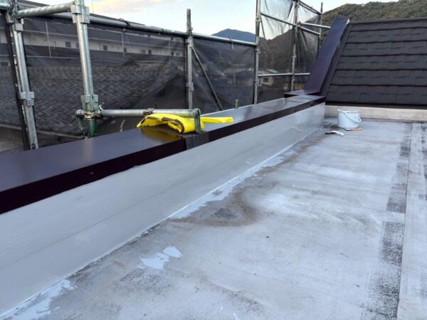 屋上の陸屋根の立ち上がり部分を塗装します、防水層をゴムベラで塗布します