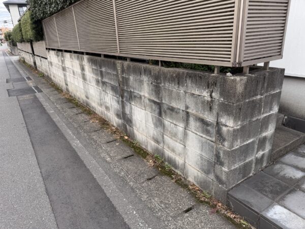 塀は長年の雨垂れ汚れが積み重なり、黒ずんでいます。
