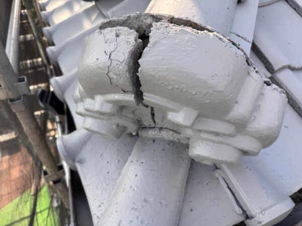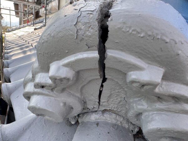 鬼瓦が割れています、上からの瓦割したかのようです(笑)