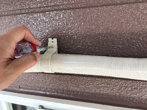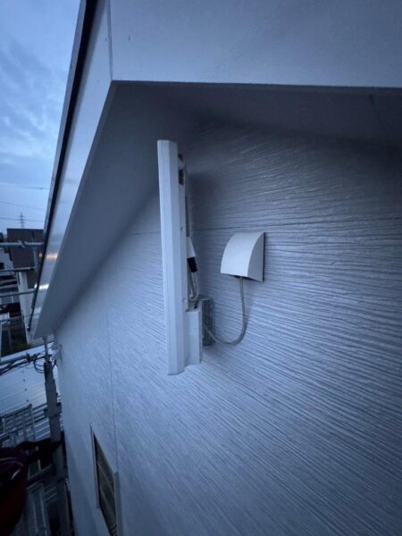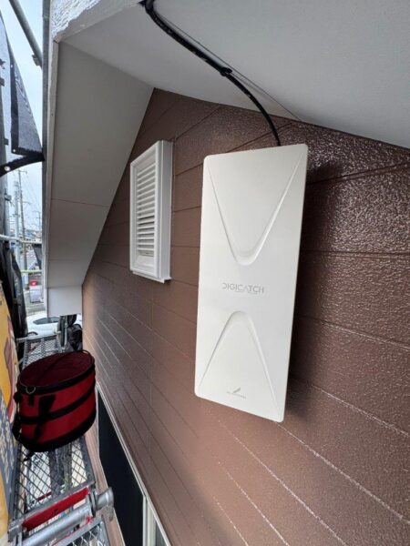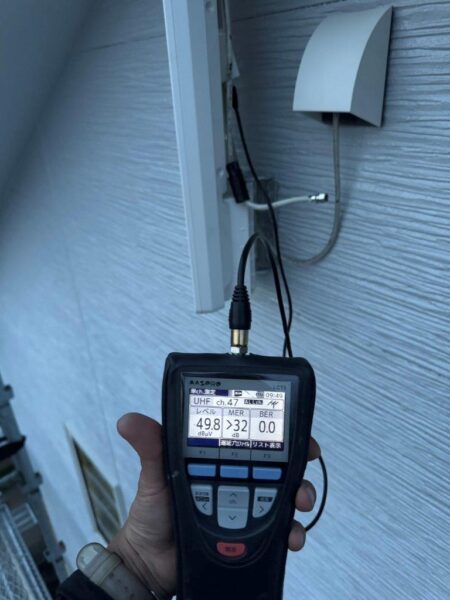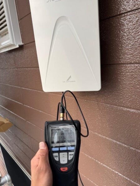 屋根からアンテナをおろして、壁面にとりつけました受信状況を確認します
