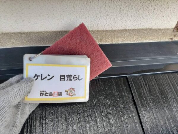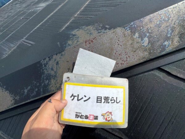 屋根の棟板金のケレン状況になります、サビていますね。前回の塗装工事では錆止め塗装をやってないとおもいます