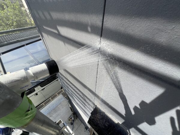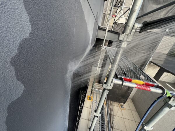 外壁やサッシ周りなど、複数個所散水をおこないます。