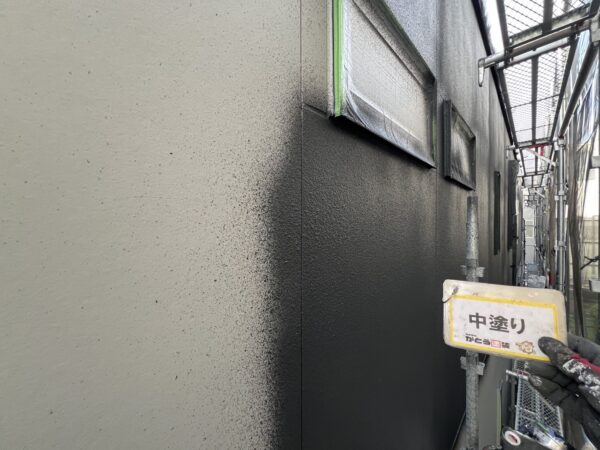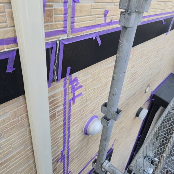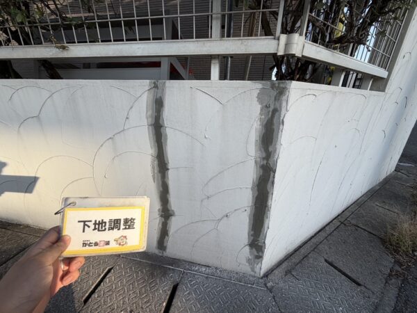 塀の下地調整の様子です。コーキング乾燥後に樹脂モルタルを塗り付けました