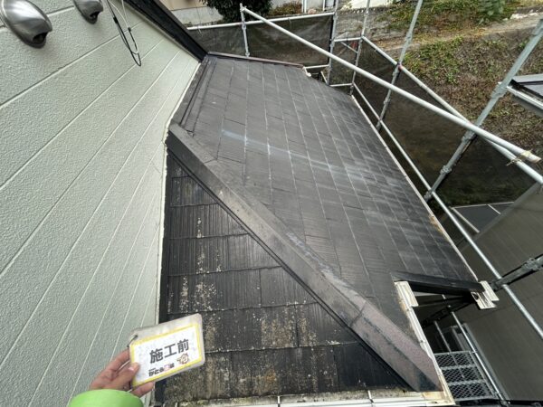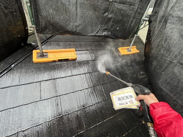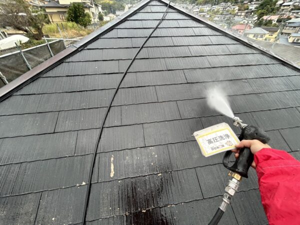 屋根の高圧洗浄の様子です。