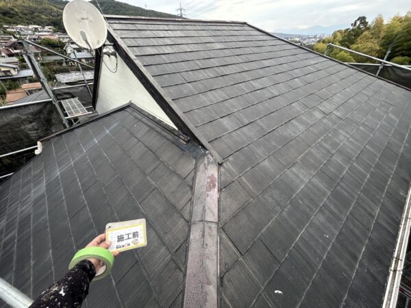 屋根は棟板金が錆びつき、全体的に色褪せや汚れ目立ち、防水機能が低下していました。