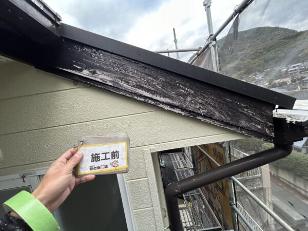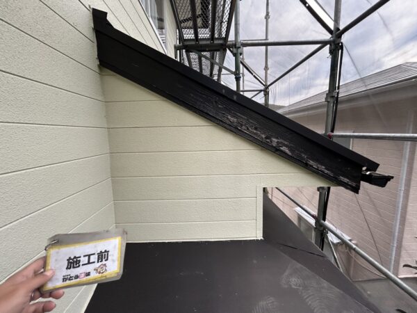 破風の木部が塗料が剥がれ、ボロボロになっていました。今回の施工では塗装ではなく破風板もカバー工法にて施工します