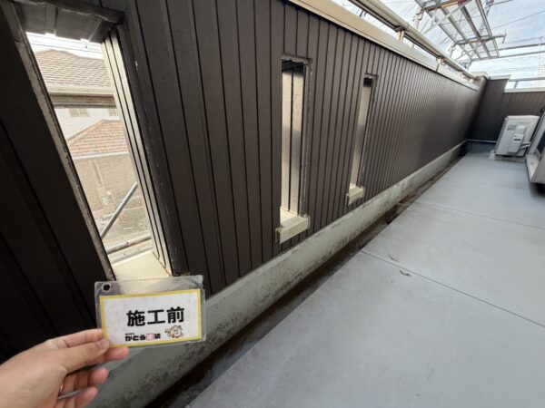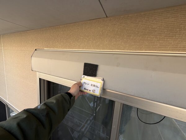 窓の庇(ひさし)、基礎部分のケレン、サビ止め塗装の様子です。