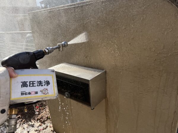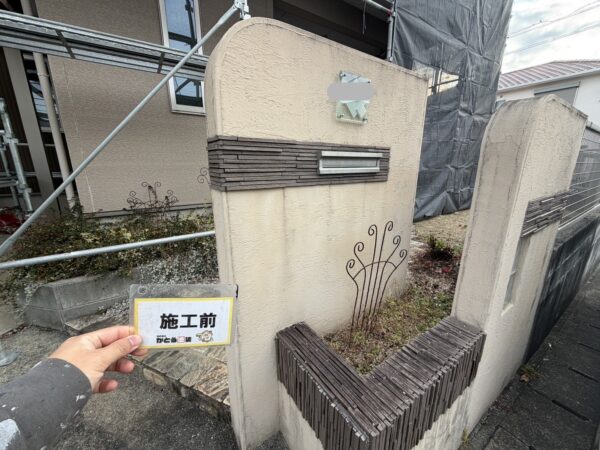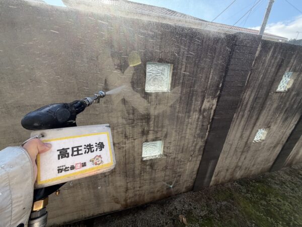 おしゃれな塀ですが、長年の汚れが蓄積し雨筋汚れが目立っています。