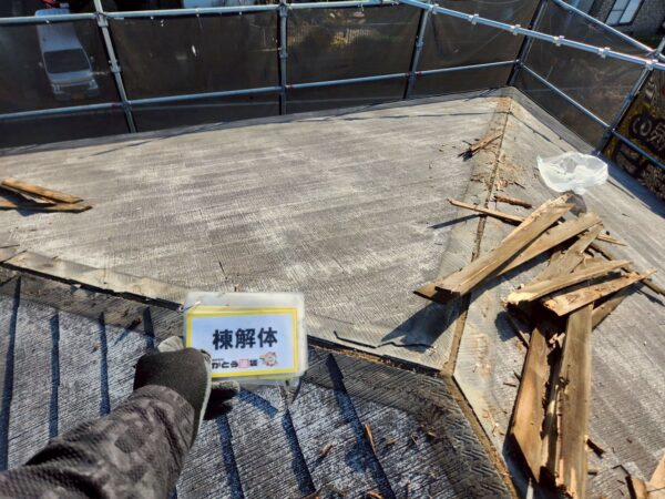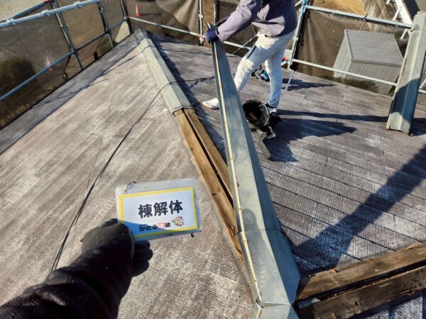 既存の棟板金を取り外す作業をしているところです。