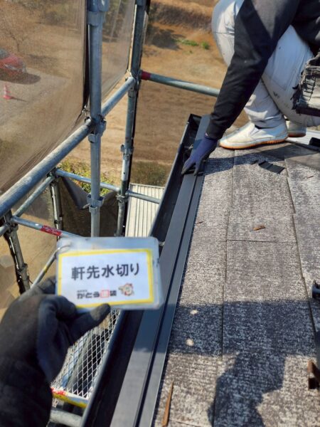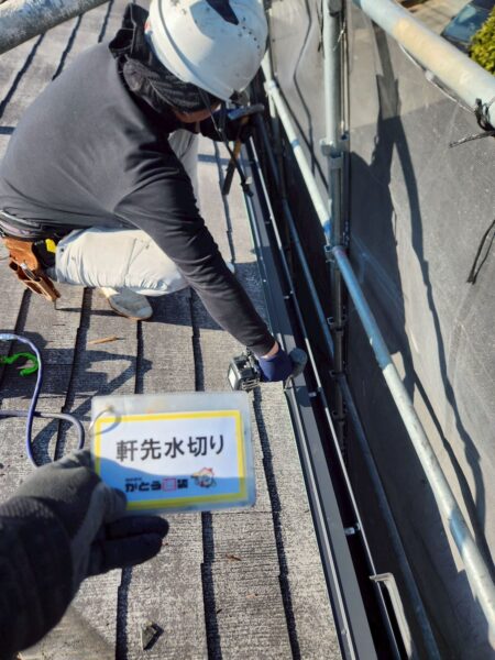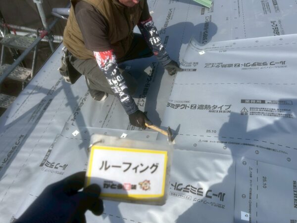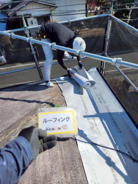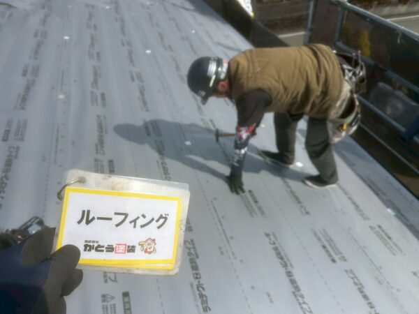 軒先水切りを取り付け、既存の屋根材の上から新しい防水紙を隙間なく貼っていきます。