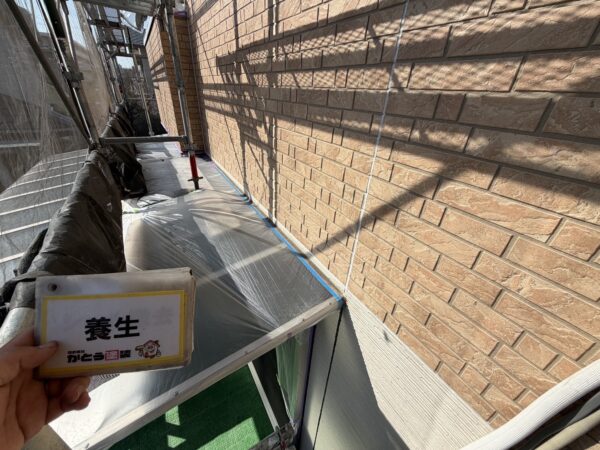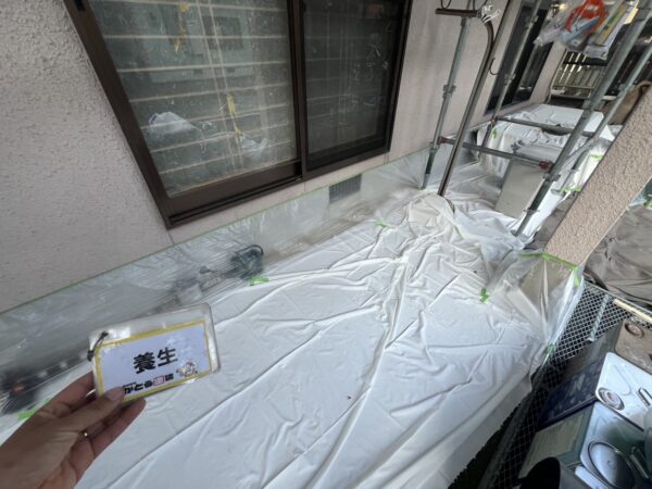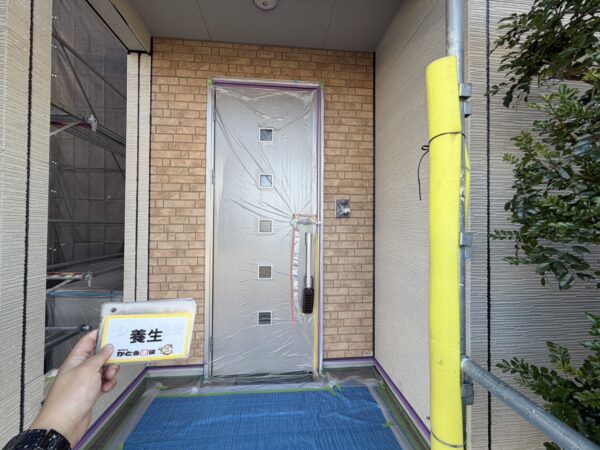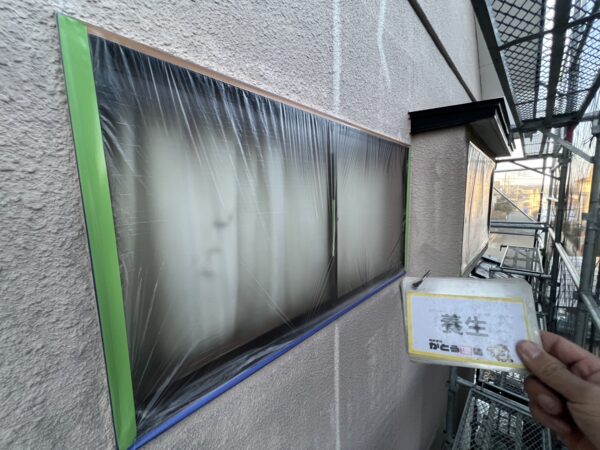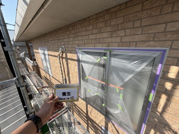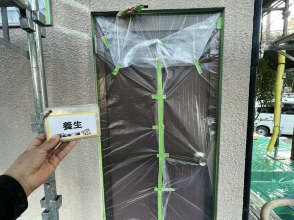 窓や玄関扉など塗料の付着を防ぐため、しっかり養生をおこないます。