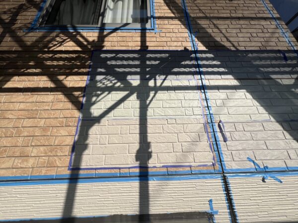 外壁はWB多彩仕上げ工法にて施工しますので、実際の壁に試し塗りをおこない、事前にカラーシュミレーションをします。