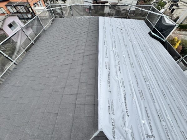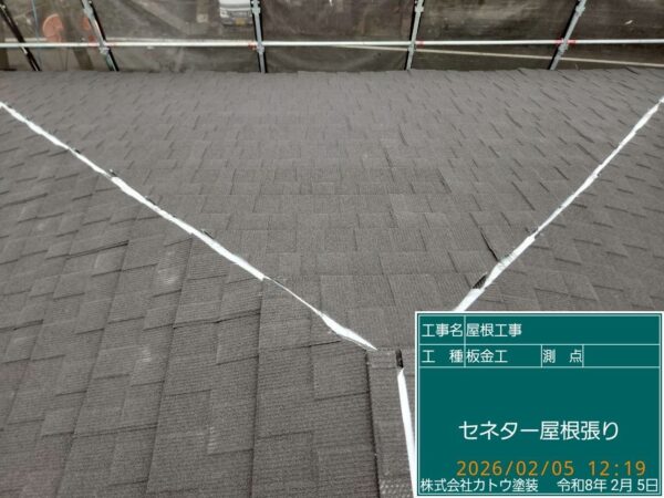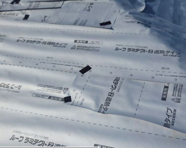 新しい防水紙を全面に貼り終わったら、その上からセネターという天然石とガルバリウム鋼板でできたハイブリッド屋根材を貼っていきます。