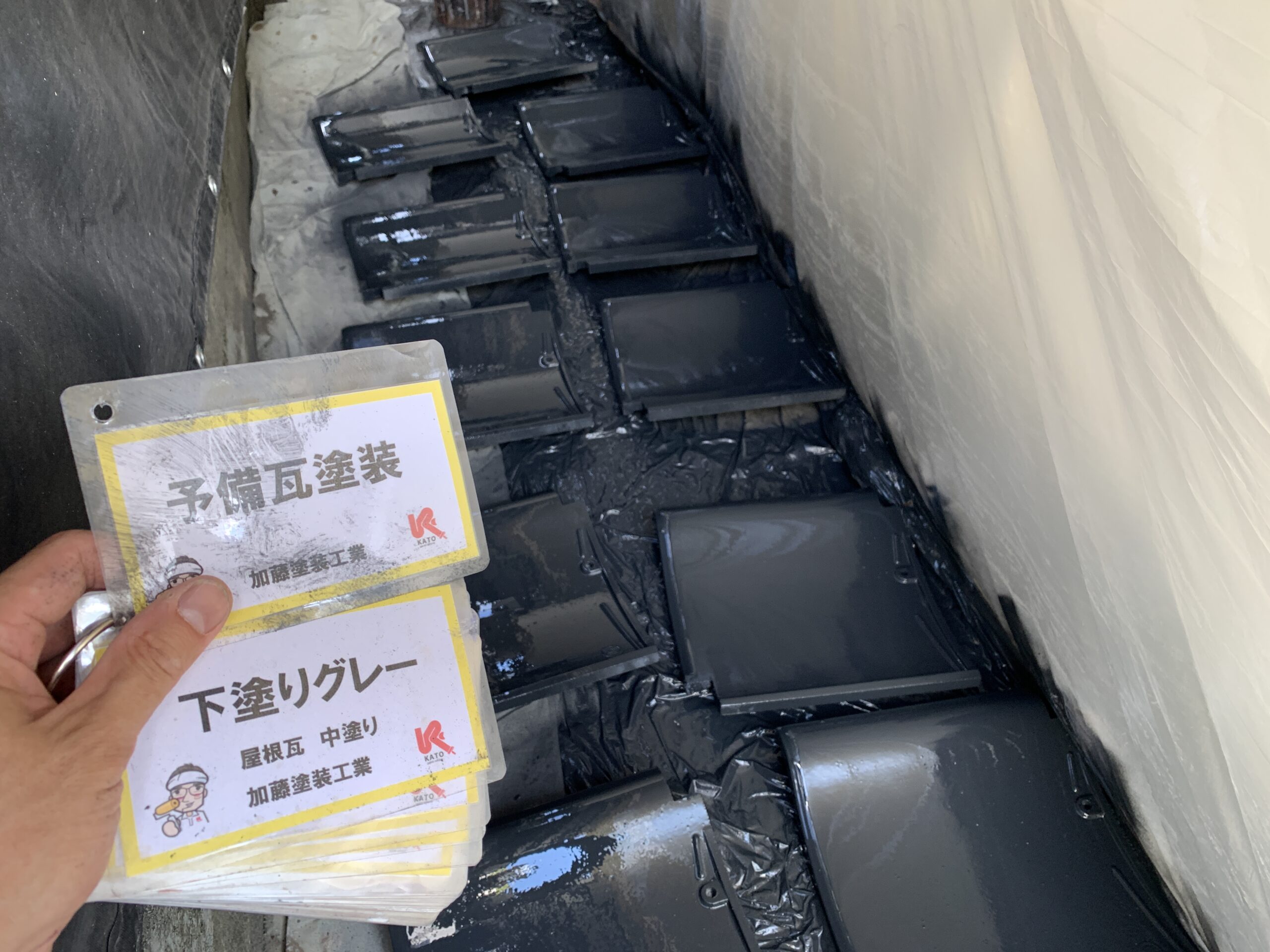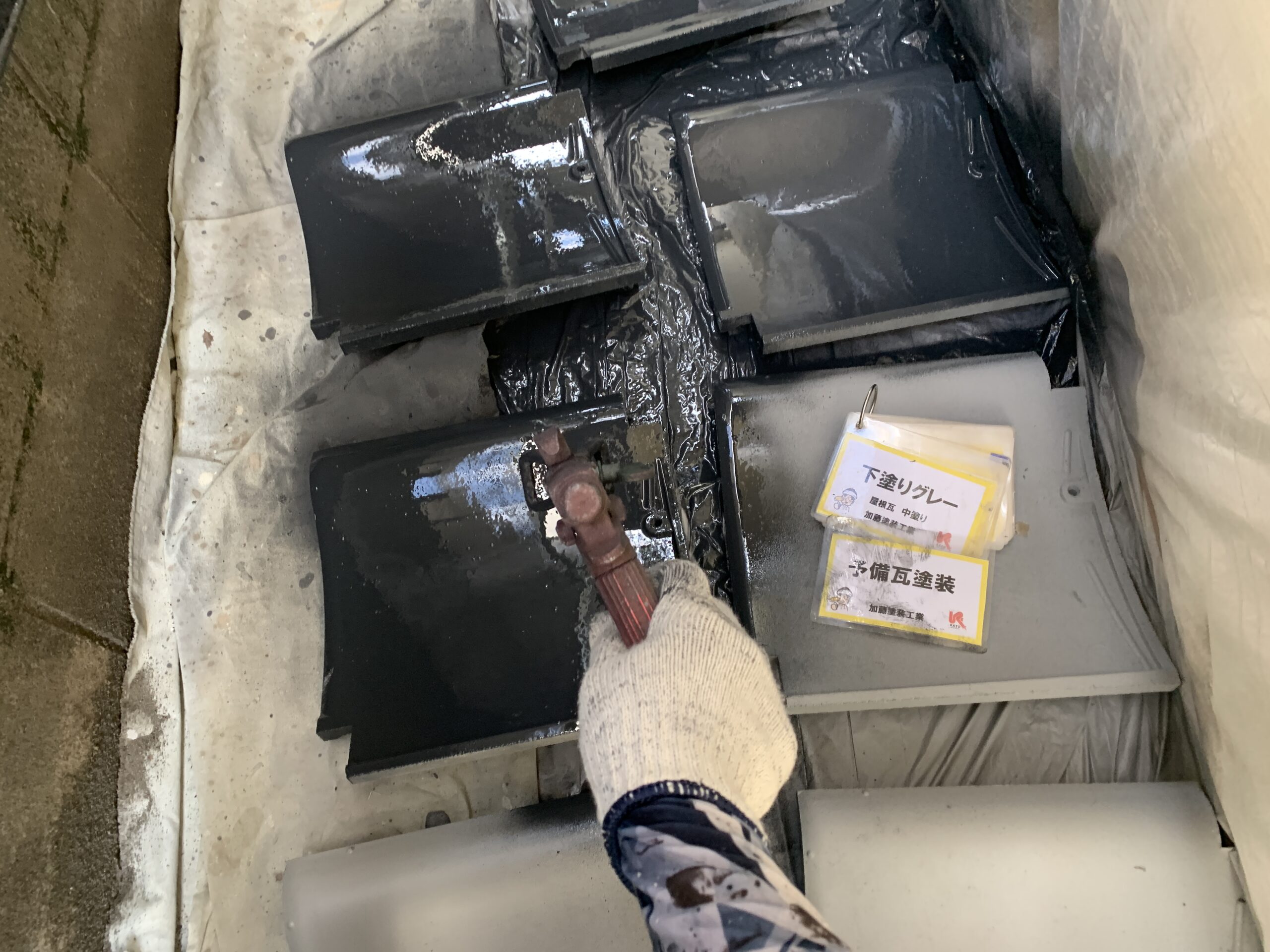 予備瓦塗装 中塗り状況です。 台風などの強風で割れてよくその箇所だけ色が違うと目にすることがありますが、こうやって塗装しておいていきますので何かあっても安心ですね