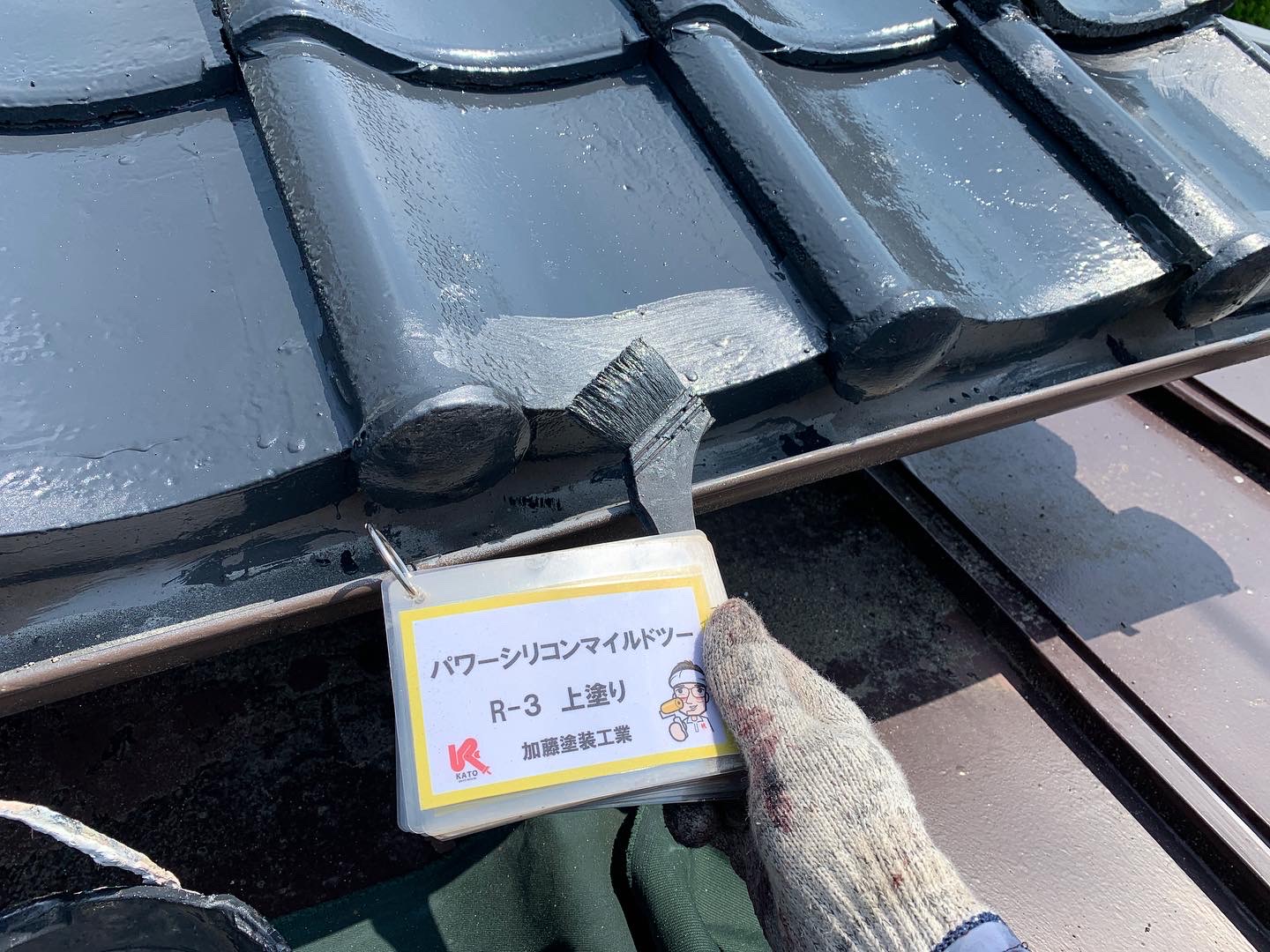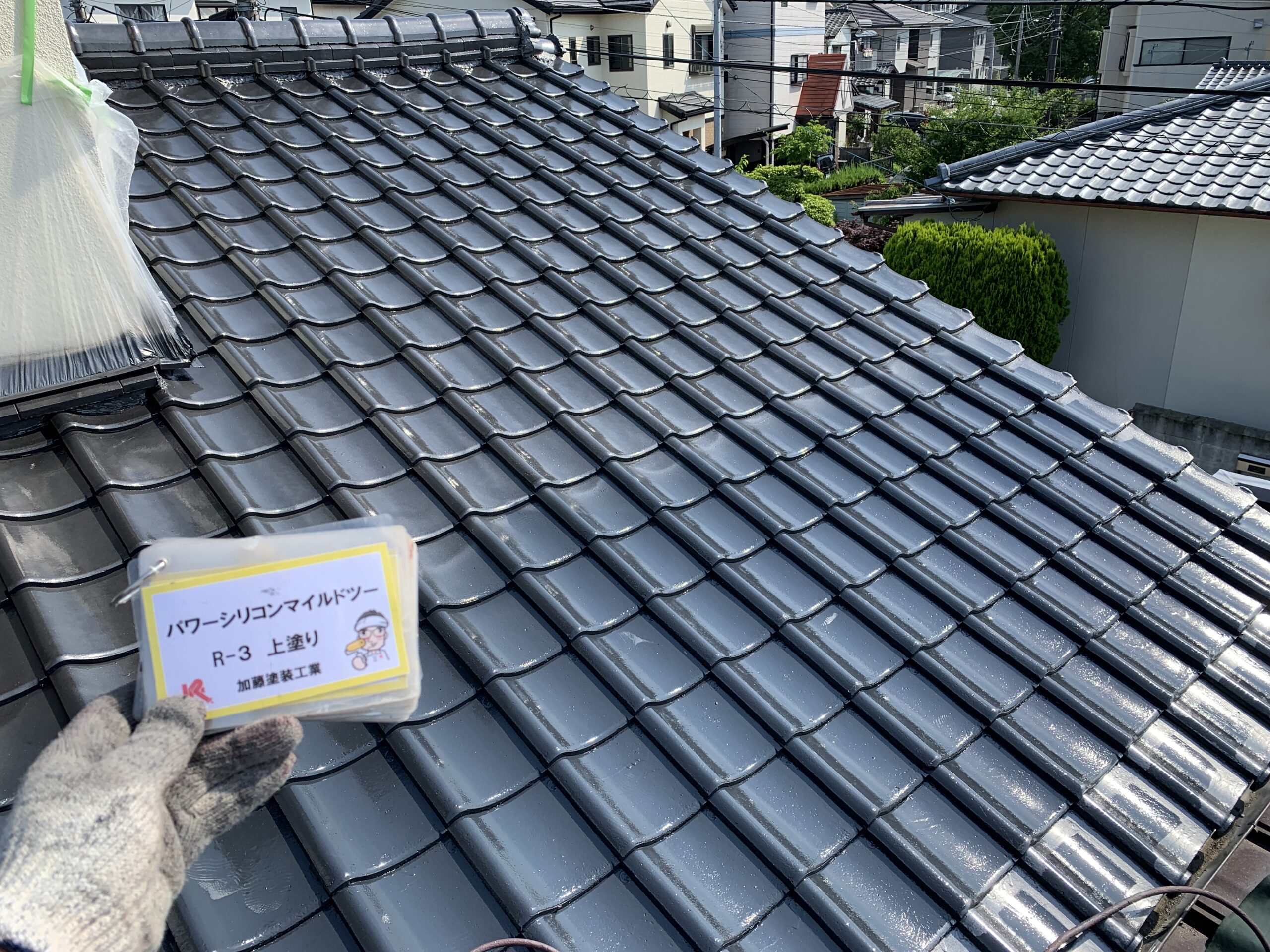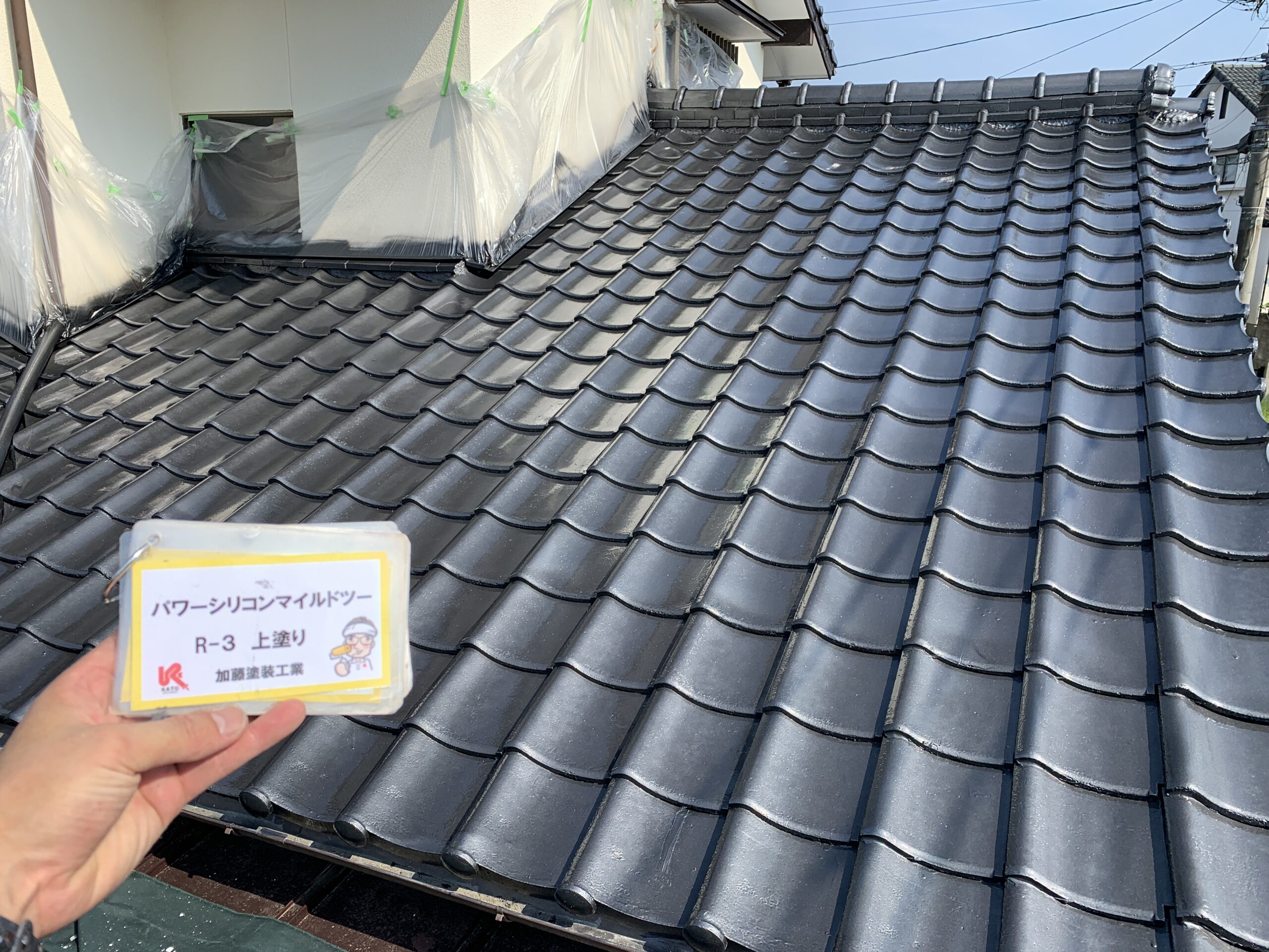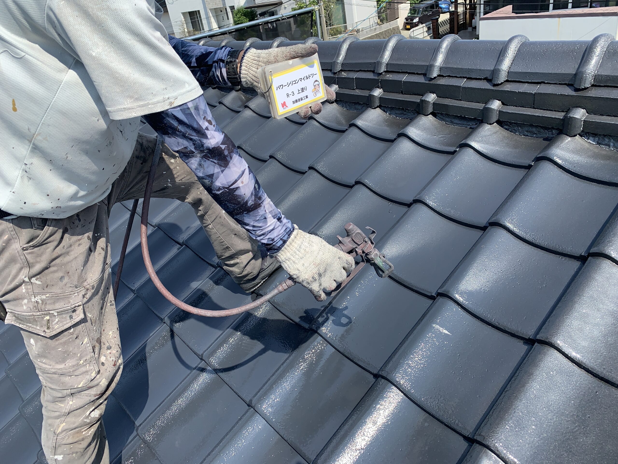 屋根瓦塗装 上塗りをおこないました。本日は天気も良く塗装日和となりました。