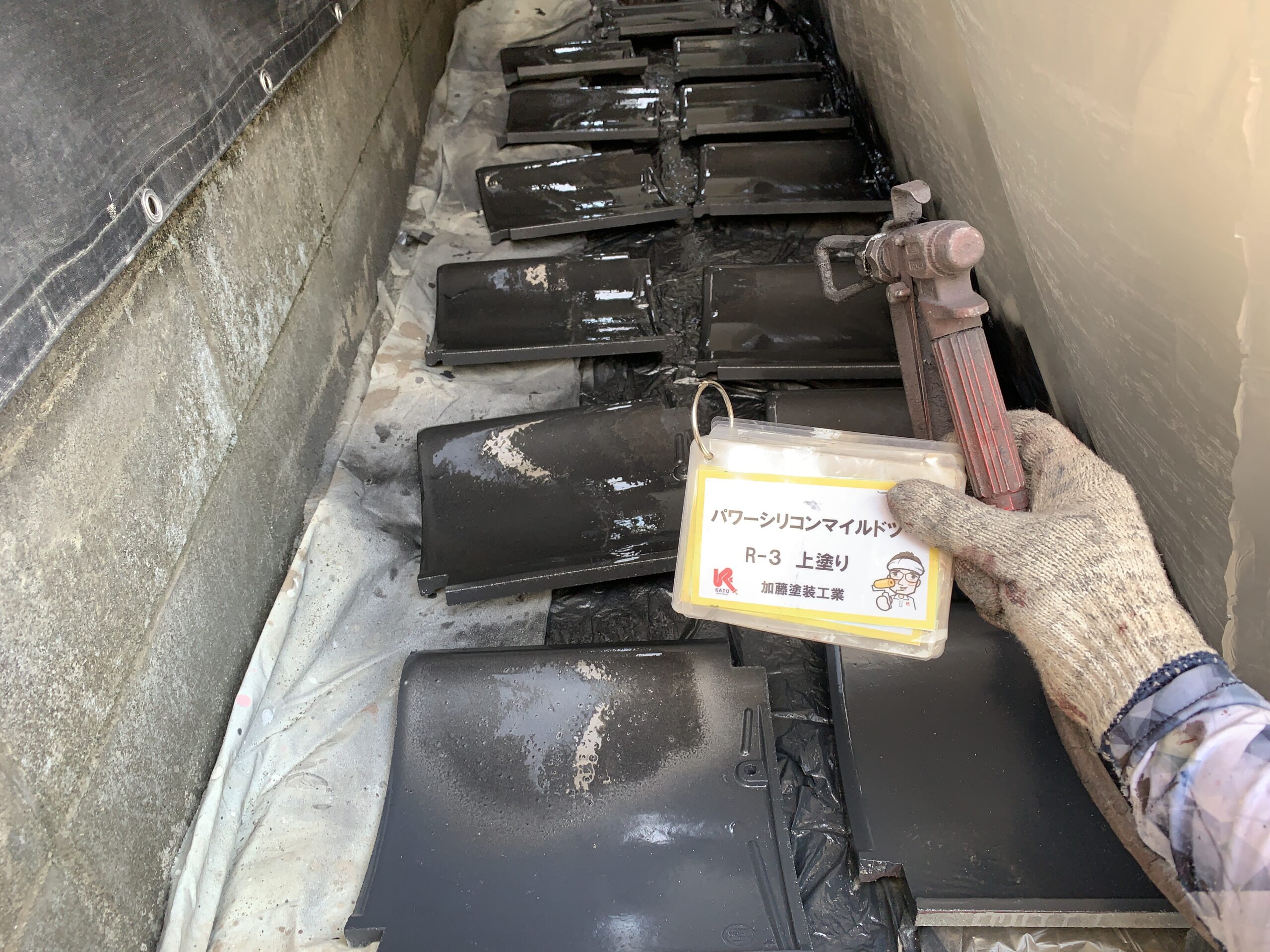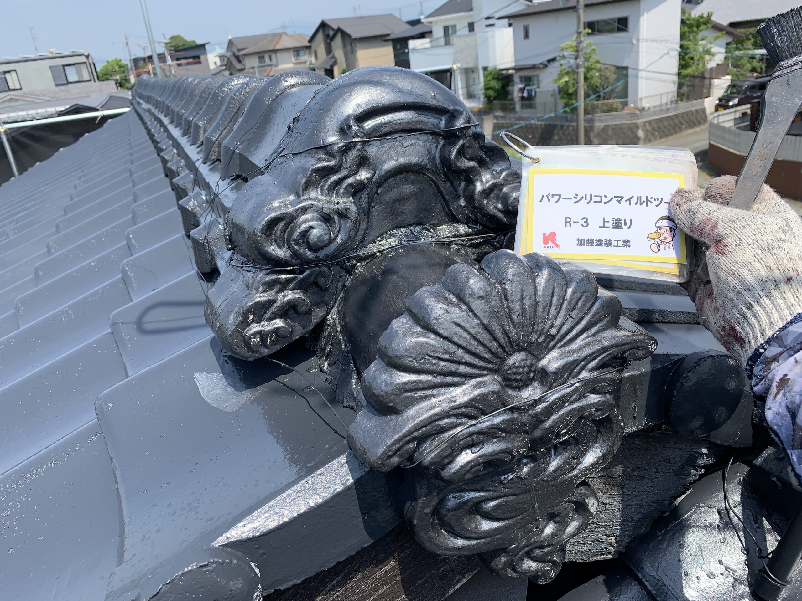 鬼瓦も手塗りしていきます。最後はエアレスで吹き付けてハケムラをなくします。いきなりエアレスで吹き付けるとダラダラながれるからハケをとってから塗ります。