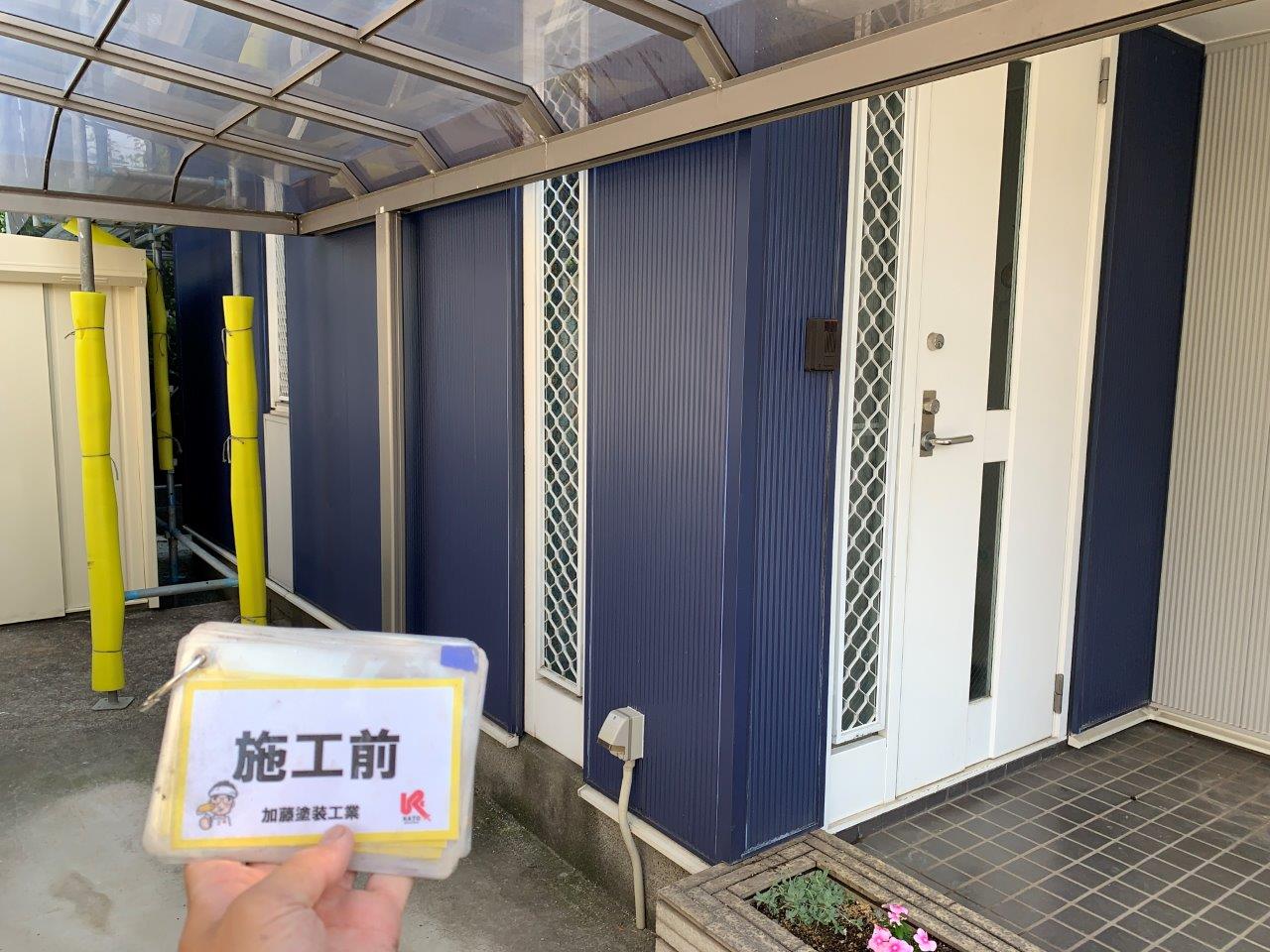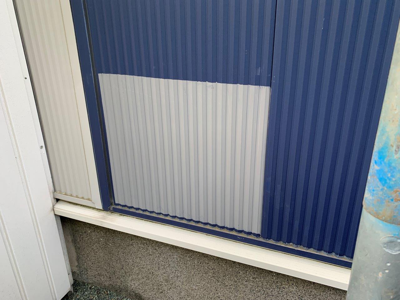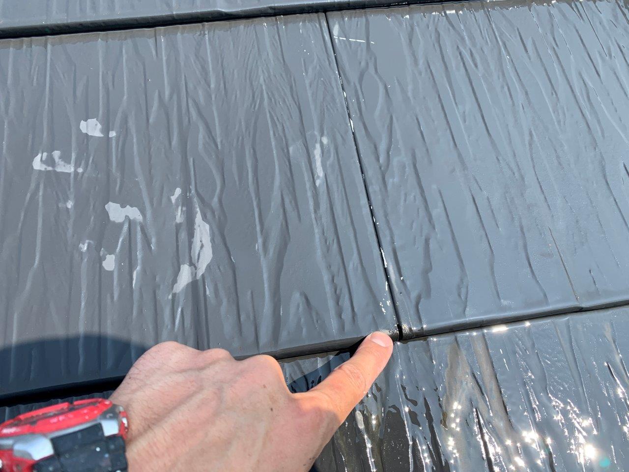 外壁・屋根ともにフッ素鋼板になります。難付着性があるので、普通のプライマーでは塗装が剝がれてしまいます。フッ素鋼板専用のプライマーで試し塗りをしている状態です。なんとこのプライマーでも剥がれてきてしまう下地があるとメーカーさんがおっしゃっていたのでここのご自宅の場合はセーフでした。なんでも素材のフッ素含有量できまるみたいです。高耐久の素材ですがその周りのシーリングが劣化してダメになってしまうので塗装は必要になります。フッ素鋼板に外壁をしてから17年と施主様はおっしゃっていました。シーリングもかなり高耐久のものでいかないとそこから雨漏りにつながる可能性はあります。