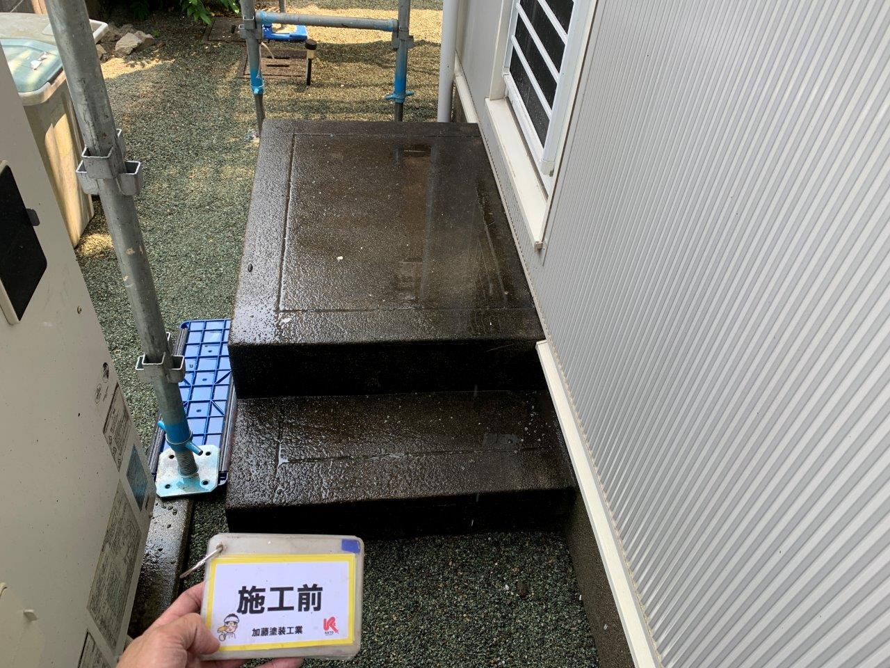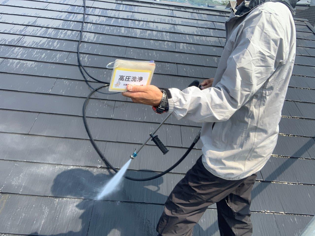 外壁高圧洗浄状況です。外壁色はツートンで施工します。フッ素塗料で施工します。