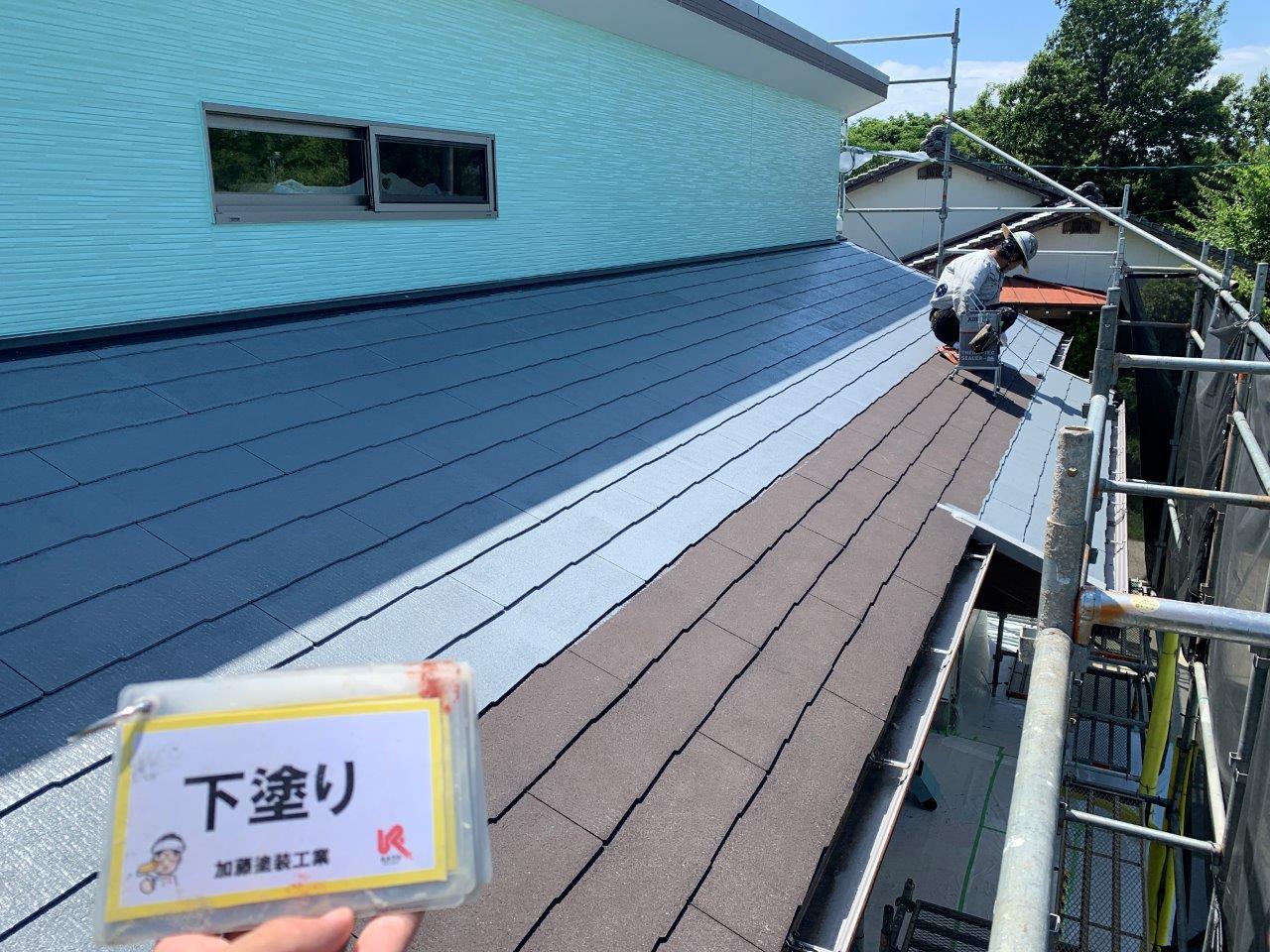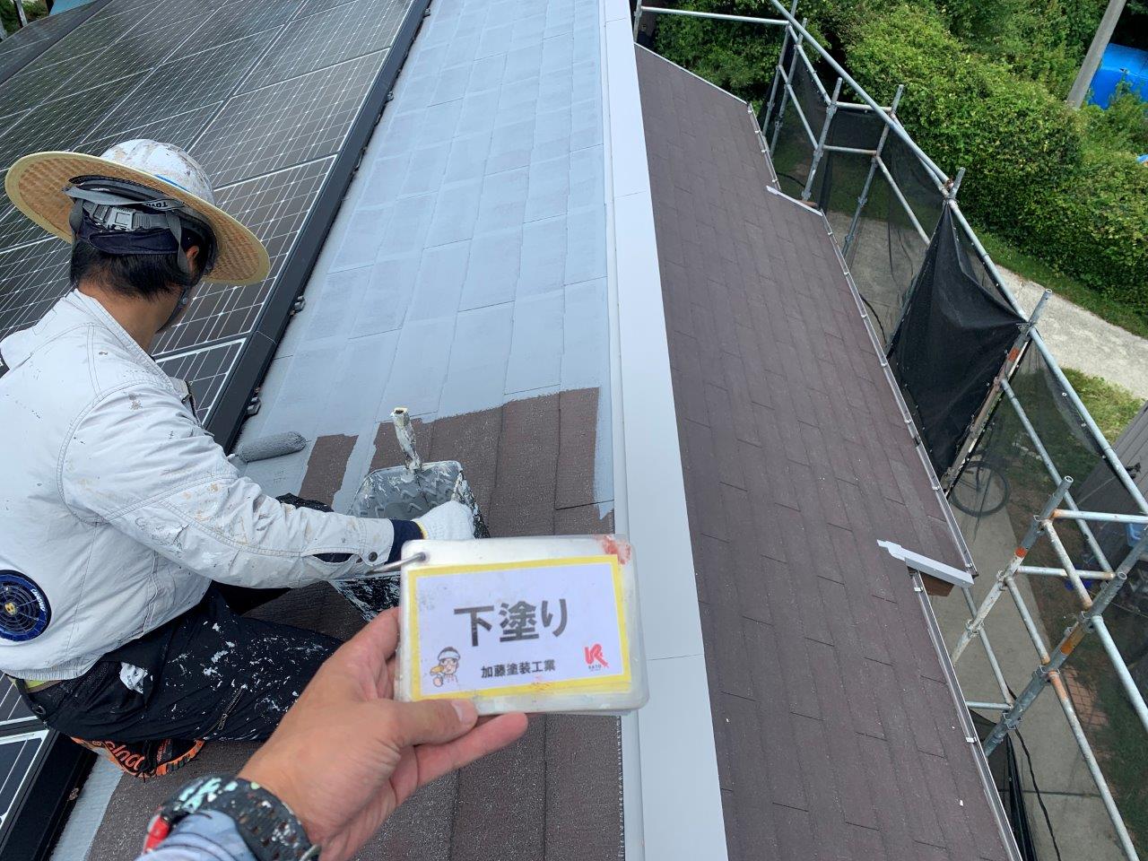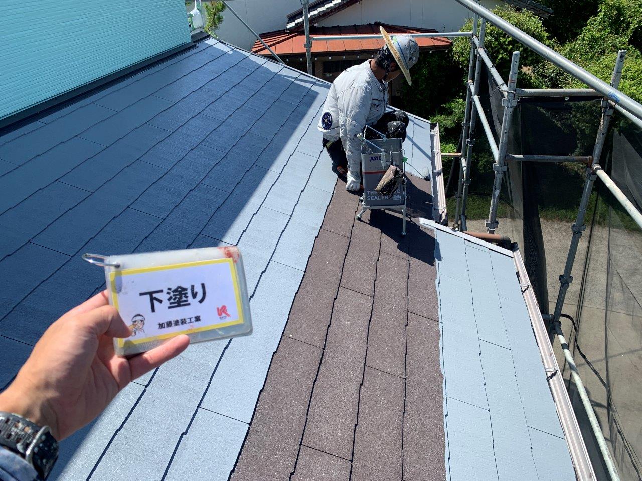 ここが他社さんと違うポイントになります。初めてのスレート屋根の塗替え工事では当社では下塗りは2回塗りです。
