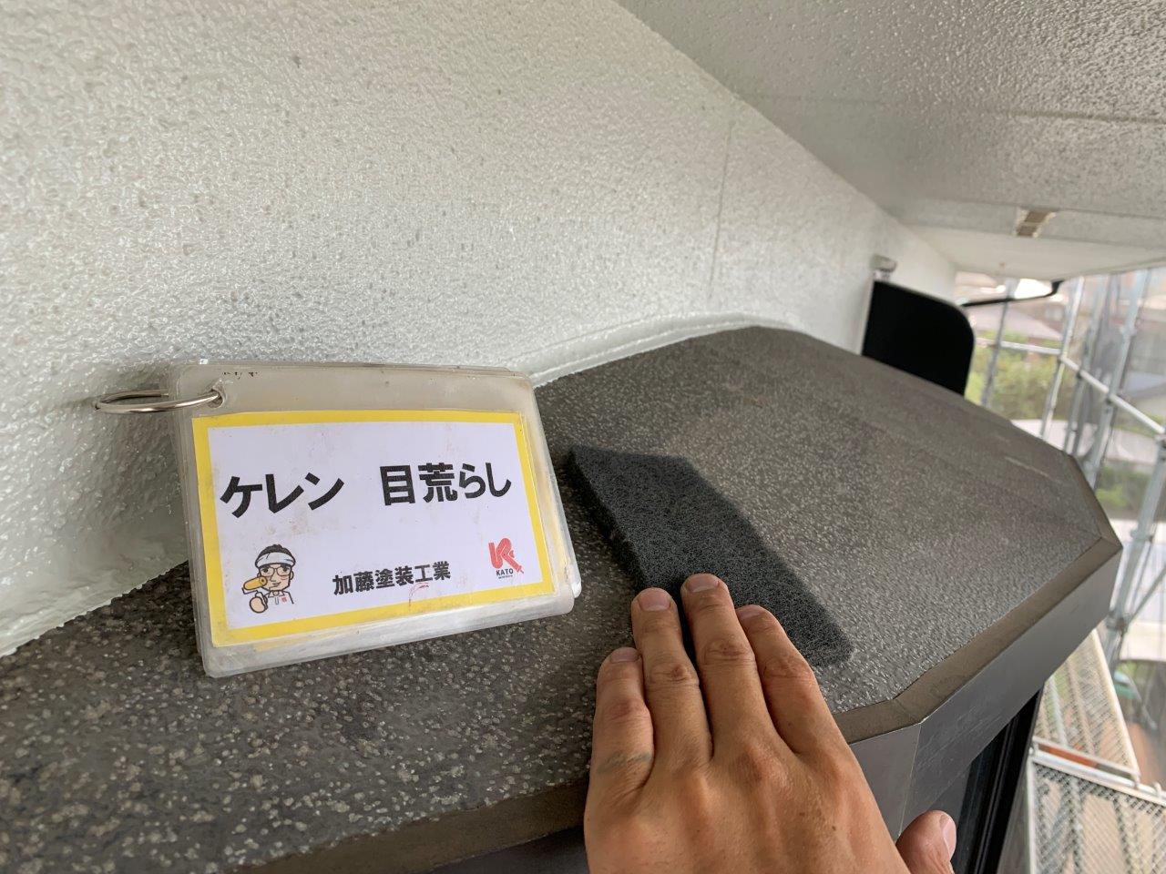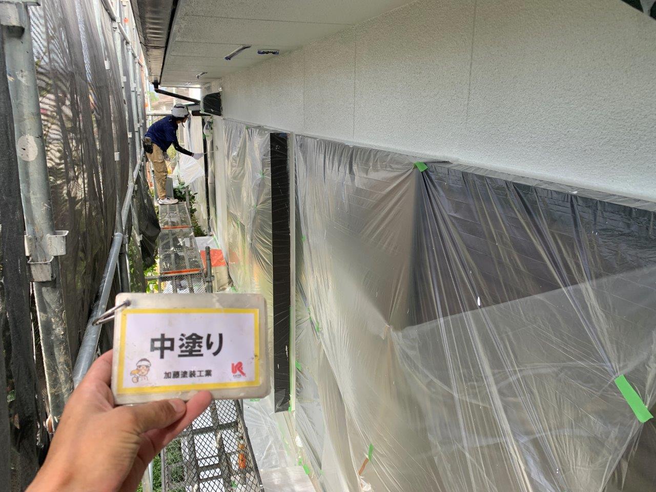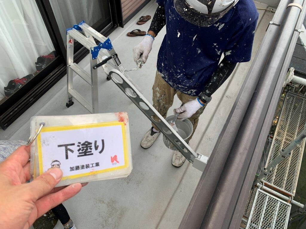 熊本市武蔵ケ丘外壁塗装 超低汚染リファイン1000MF-IR 中塗り状況です。バルコニー内