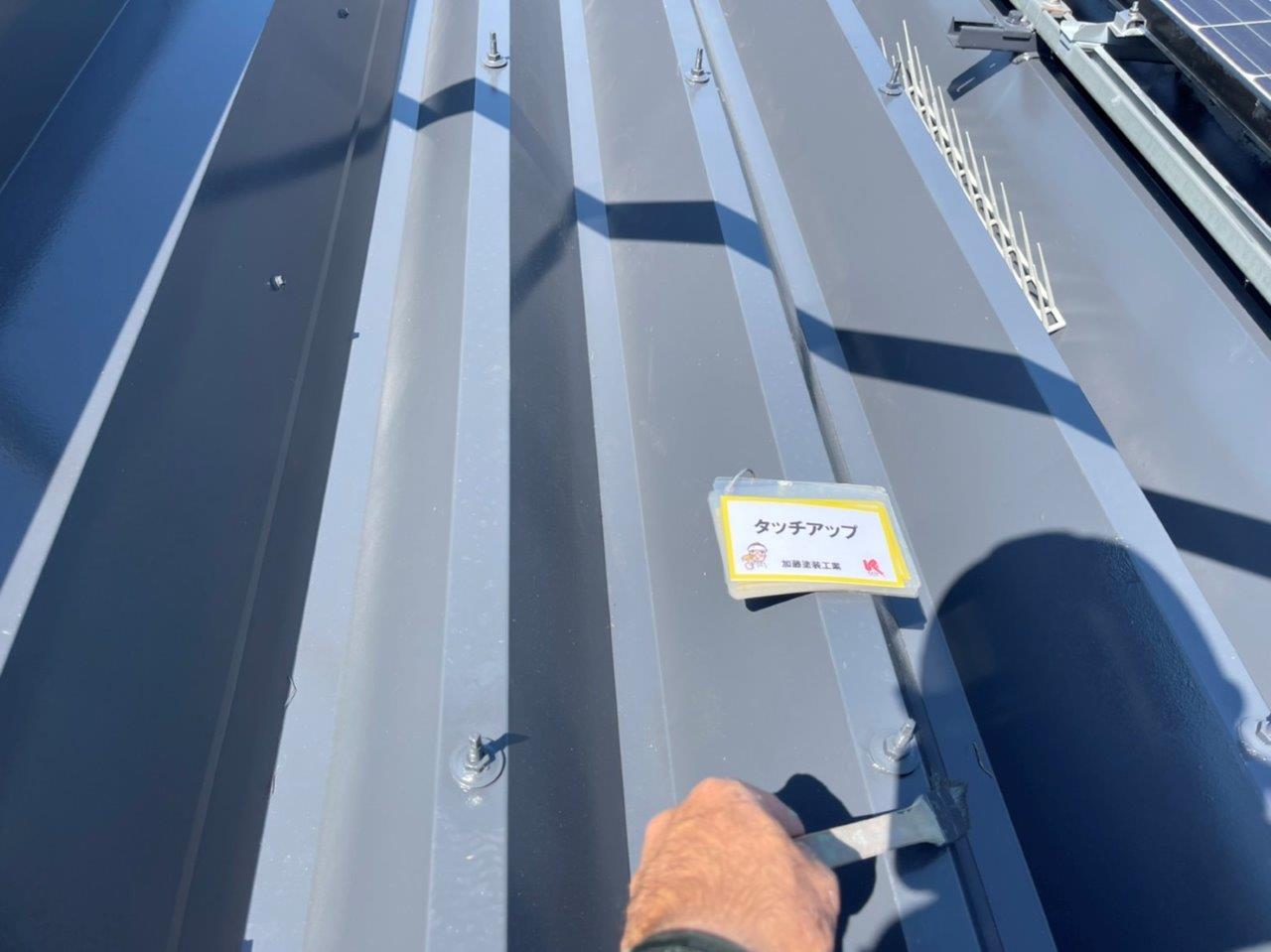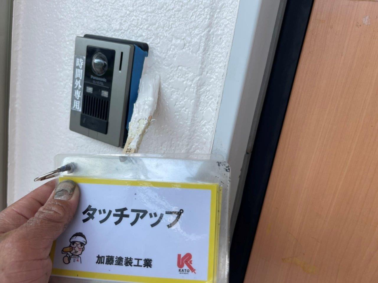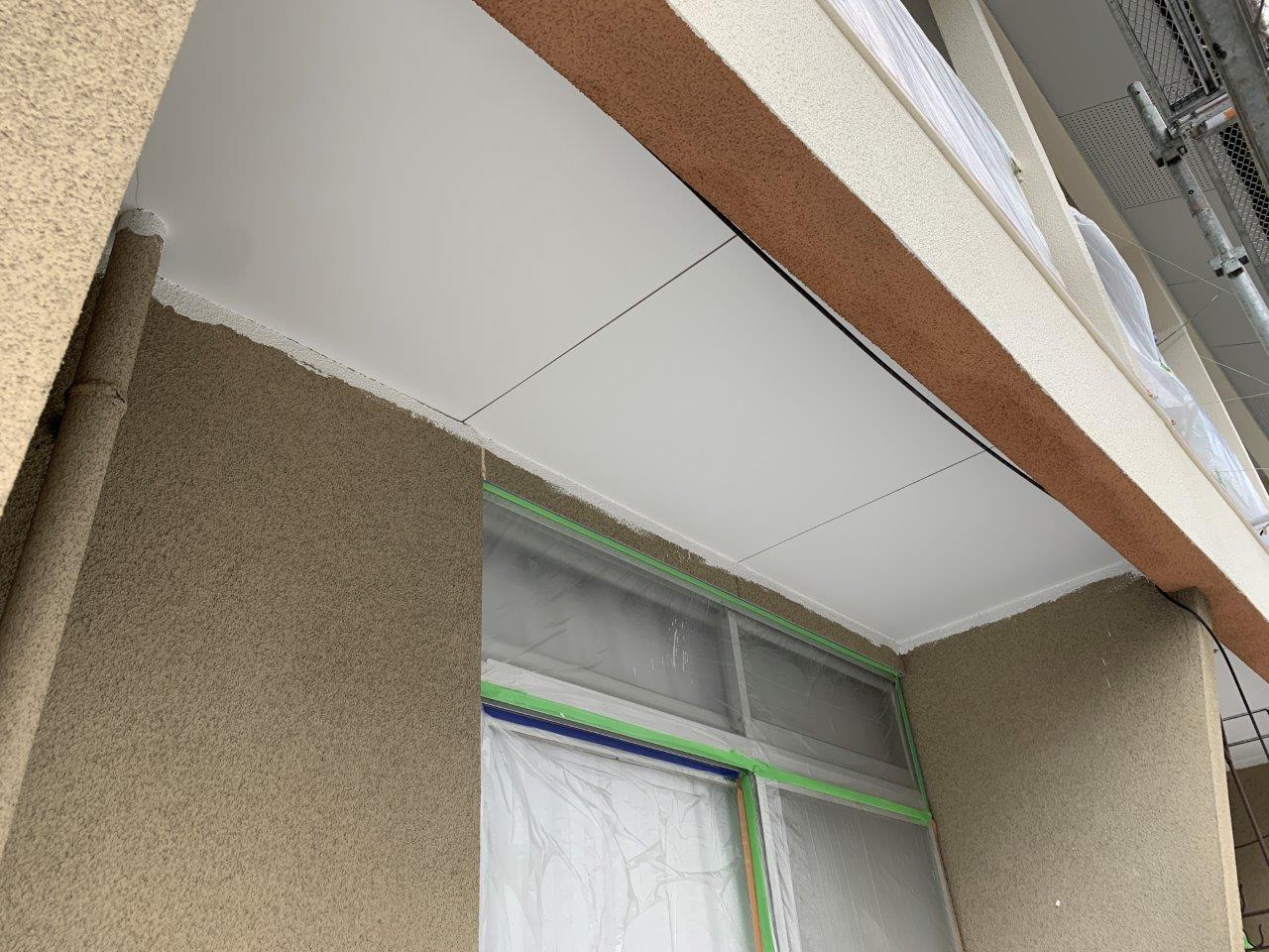 雨染みがあります。雨漏りしてますね、今回はバルコニーと二階通路は防水塗装するのでもう大丈夫です。ここの上の箇所には大きなひび割れがありました。
