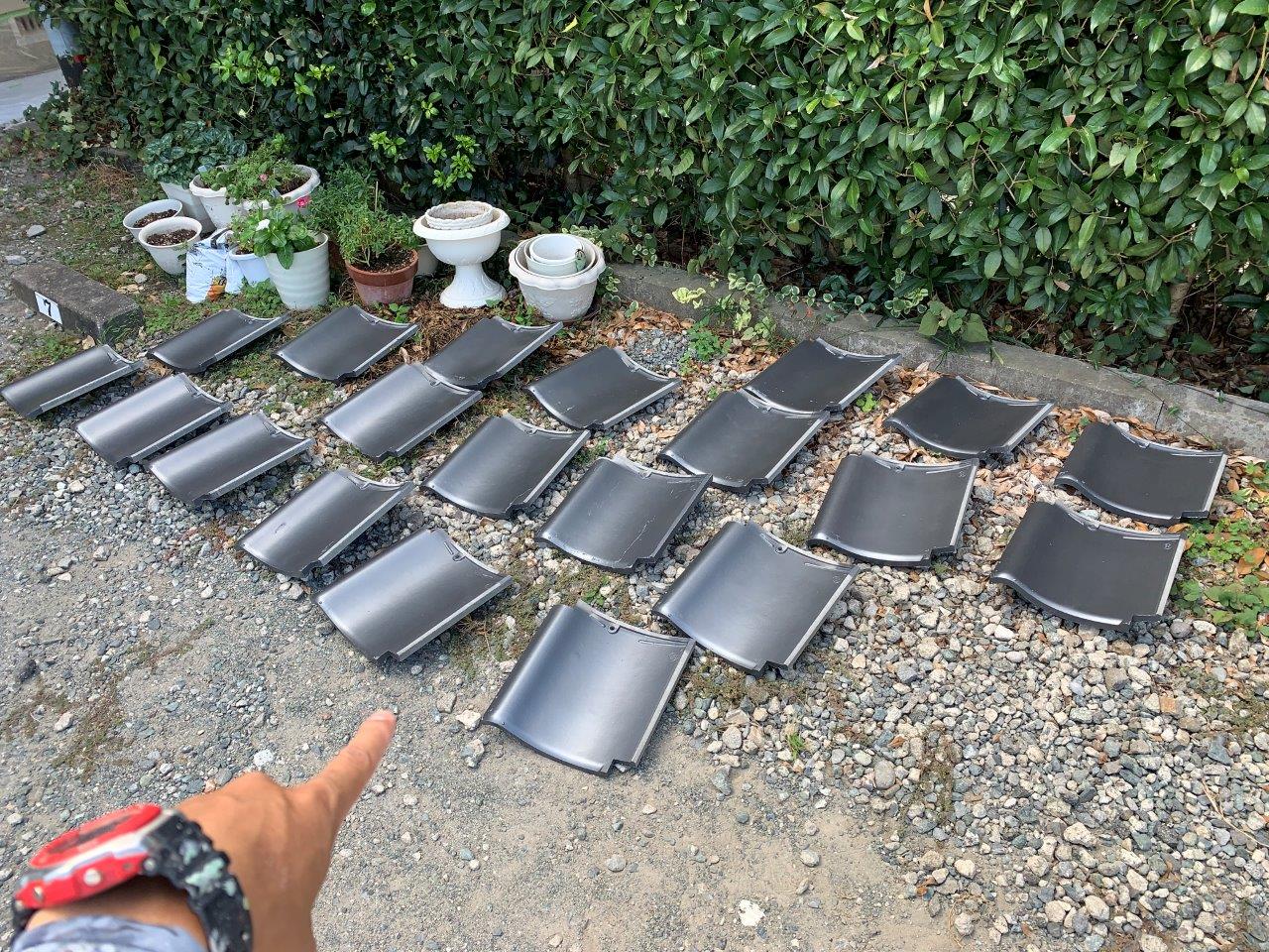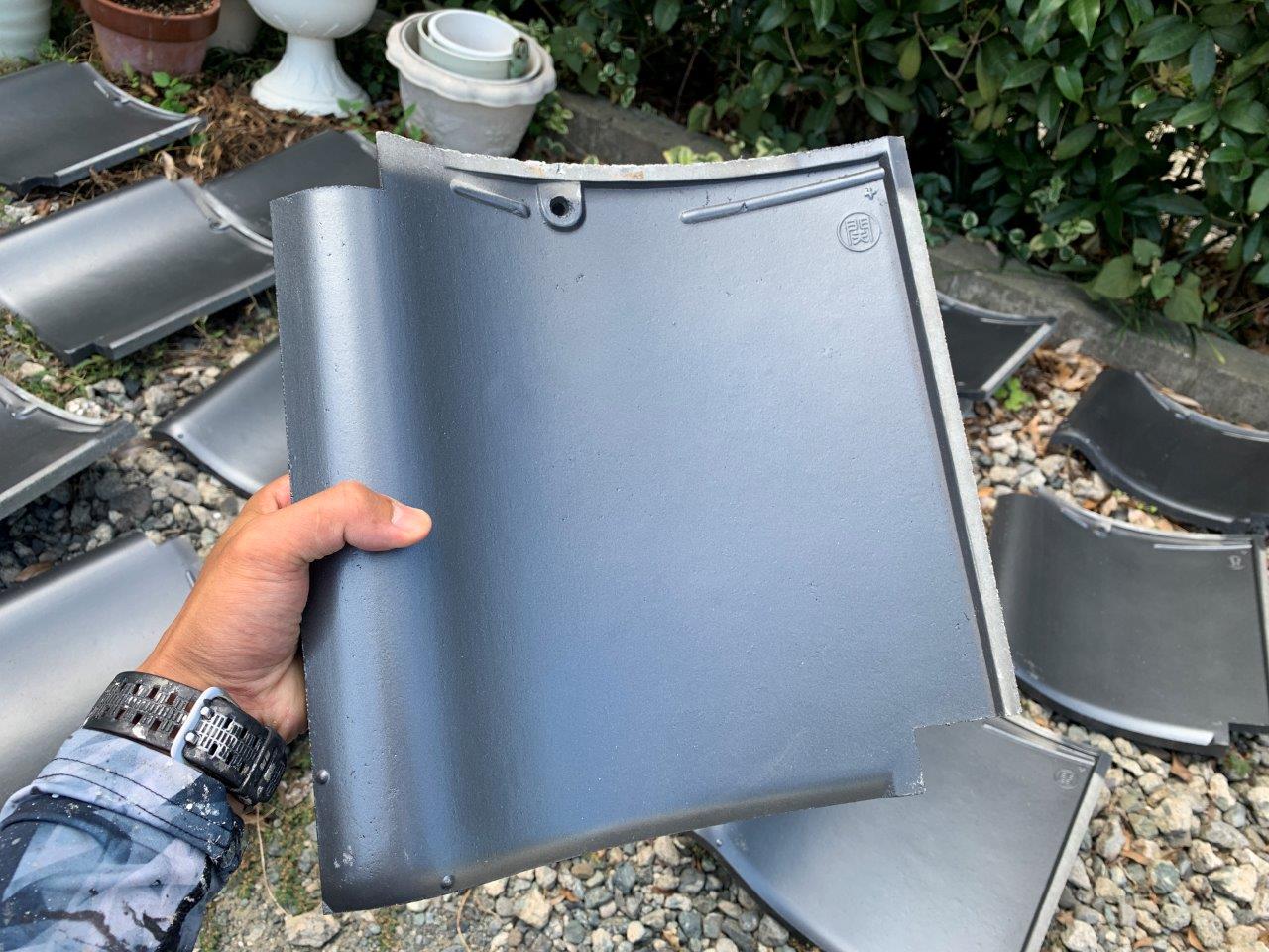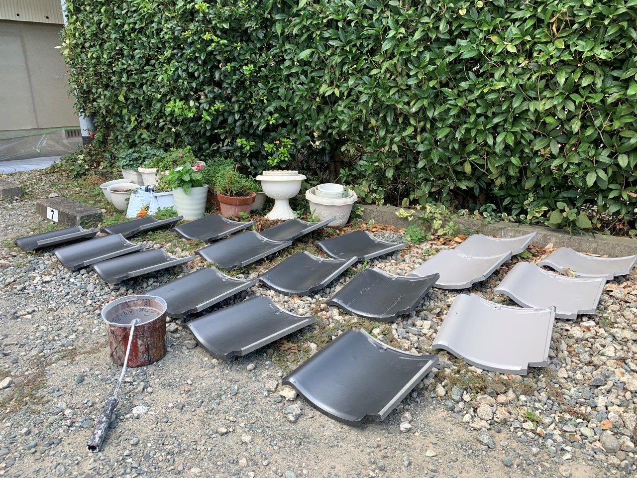 予備瓦を塗装します。いつもご自宅に予備瓦がないお客様にはこのように瓦を購入してきて、塗装しておいていきます。万が一瓦が割れて交換してもその箇所だけ色が違うっていうのを防げます。