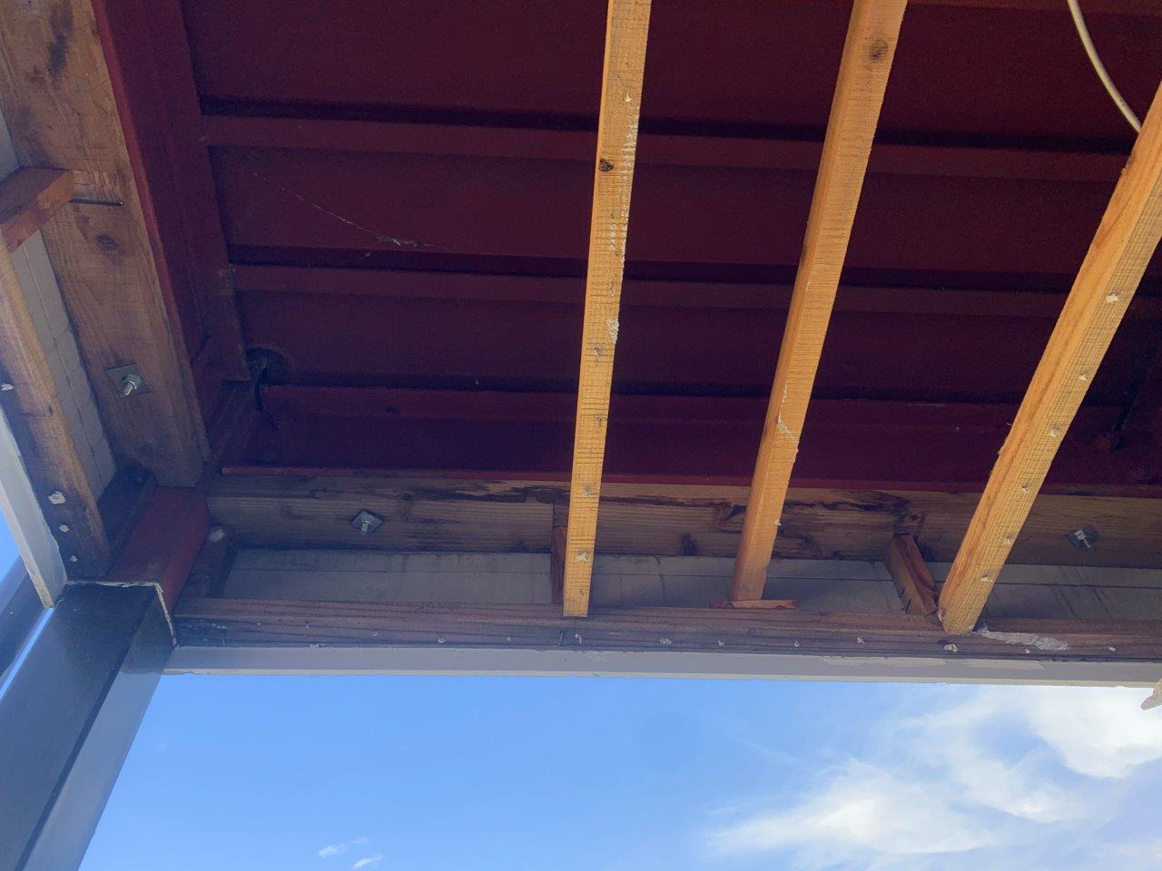 台風が過ぎ去ってから現場調査にいきました。天井が強風で剝がれています。