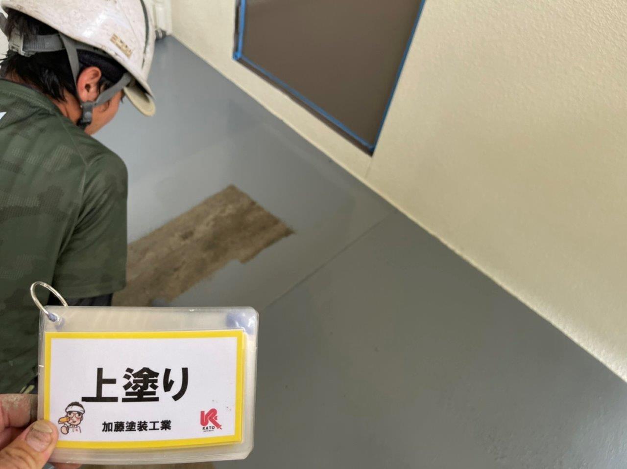 防水塗装 上塗り トップコートになります。専用の砂を塗料の中に入れて施工しております。表面がツルツルになるので滑り止め効果があります。