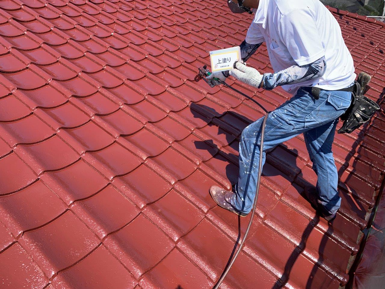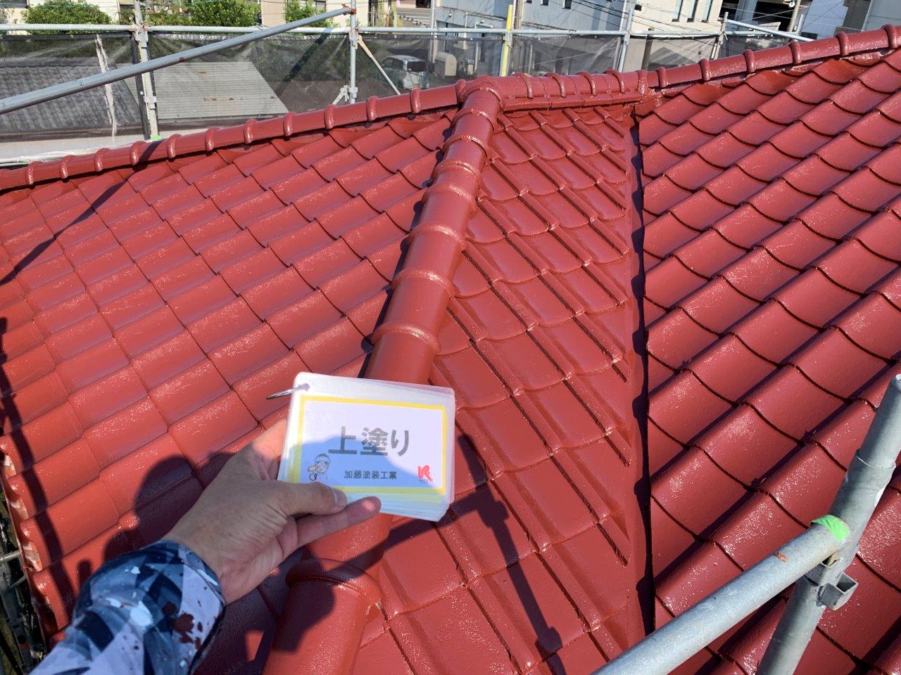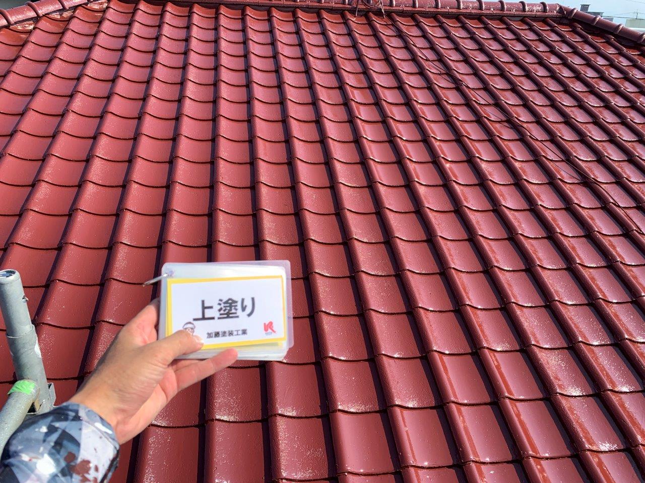 屋根瓦上塗り状況です。3回目の塗装になります。