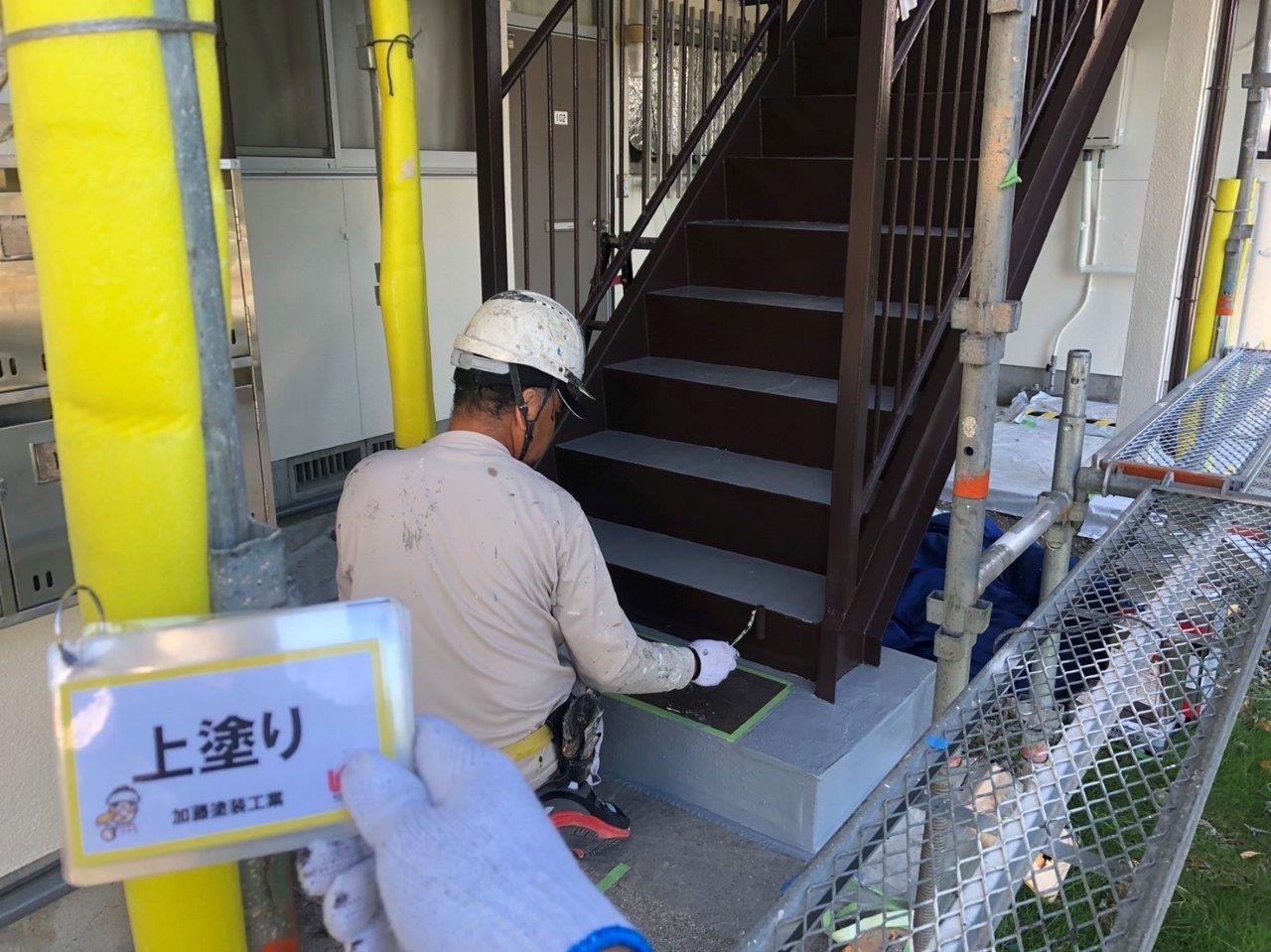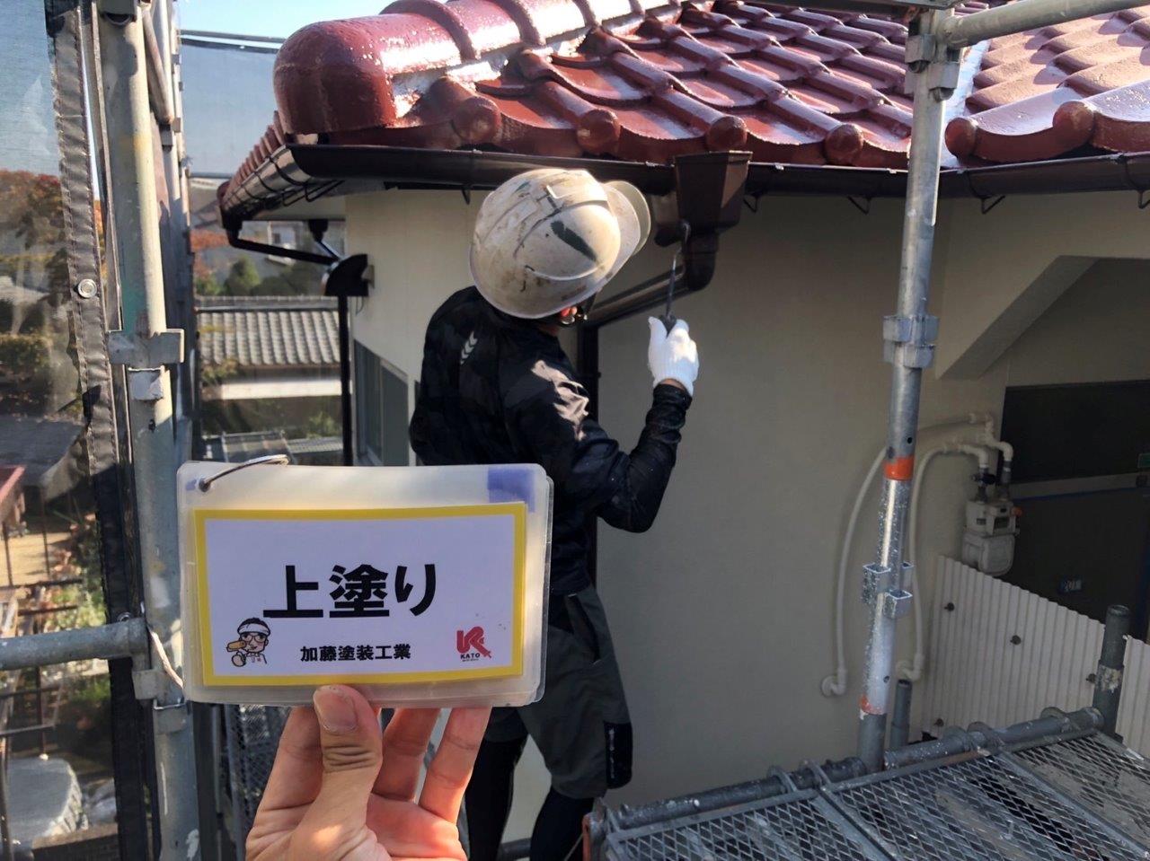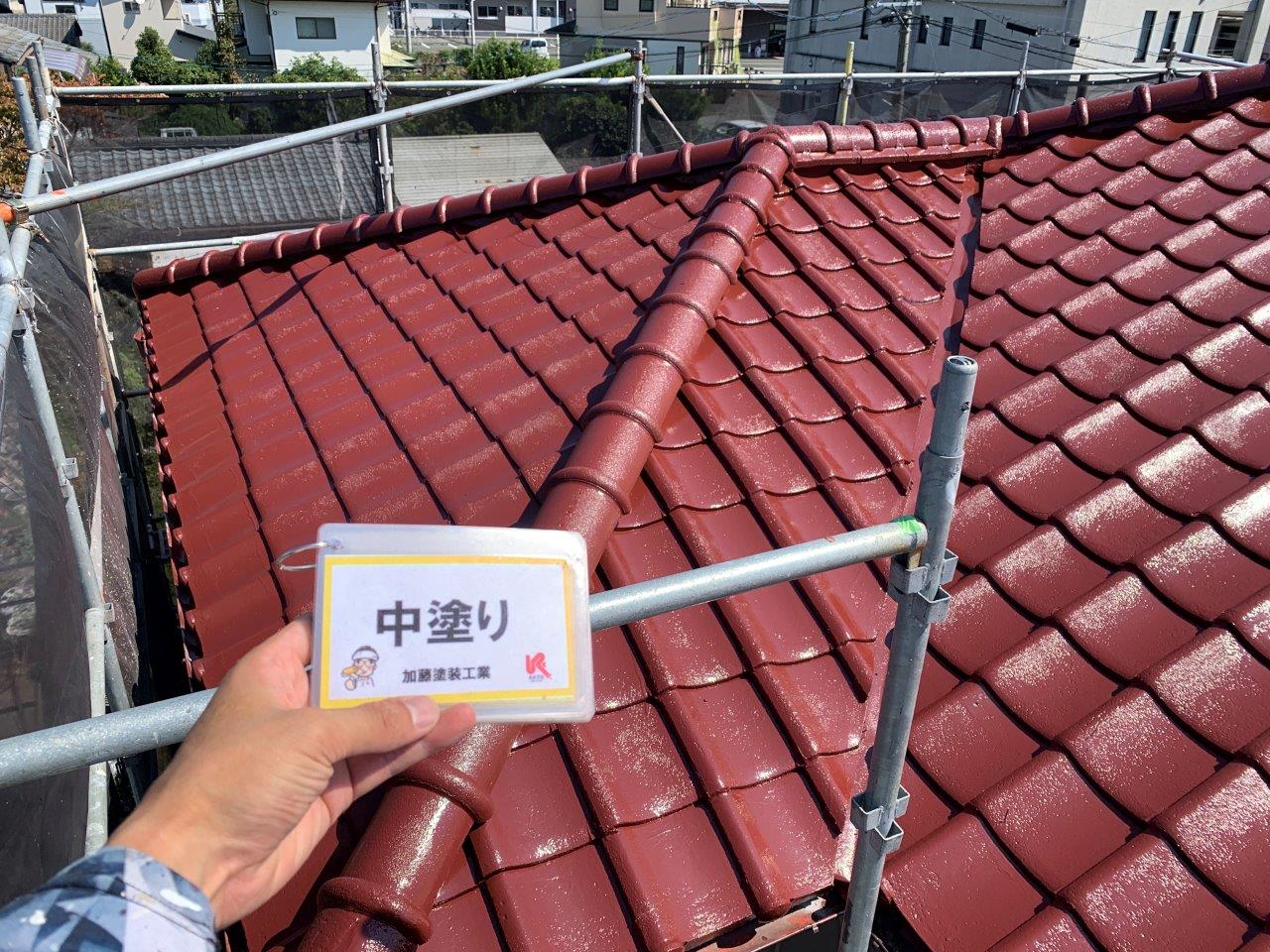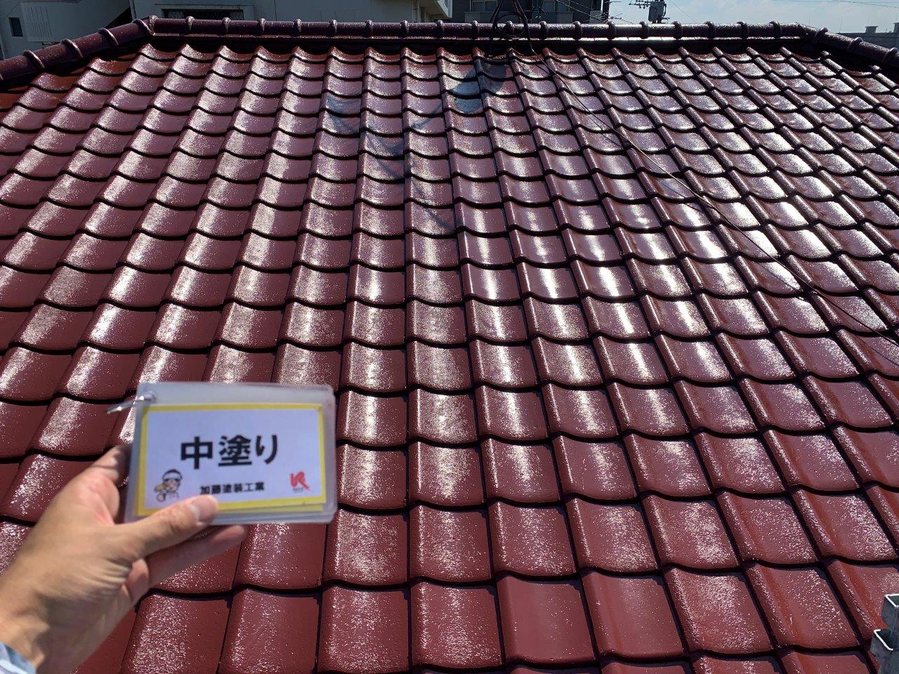 屋根瓦上塗り状況です。3回目の塗装になります。