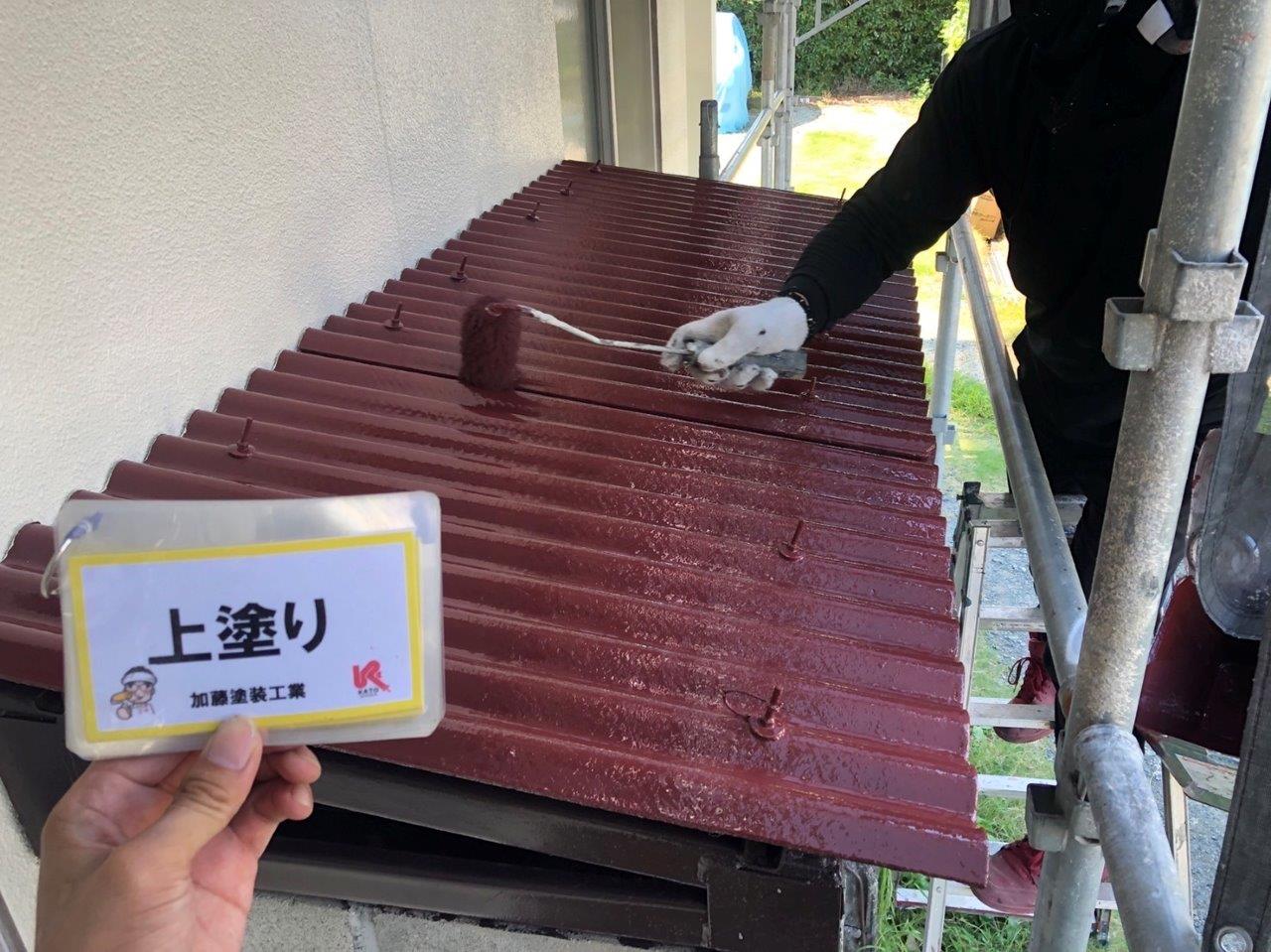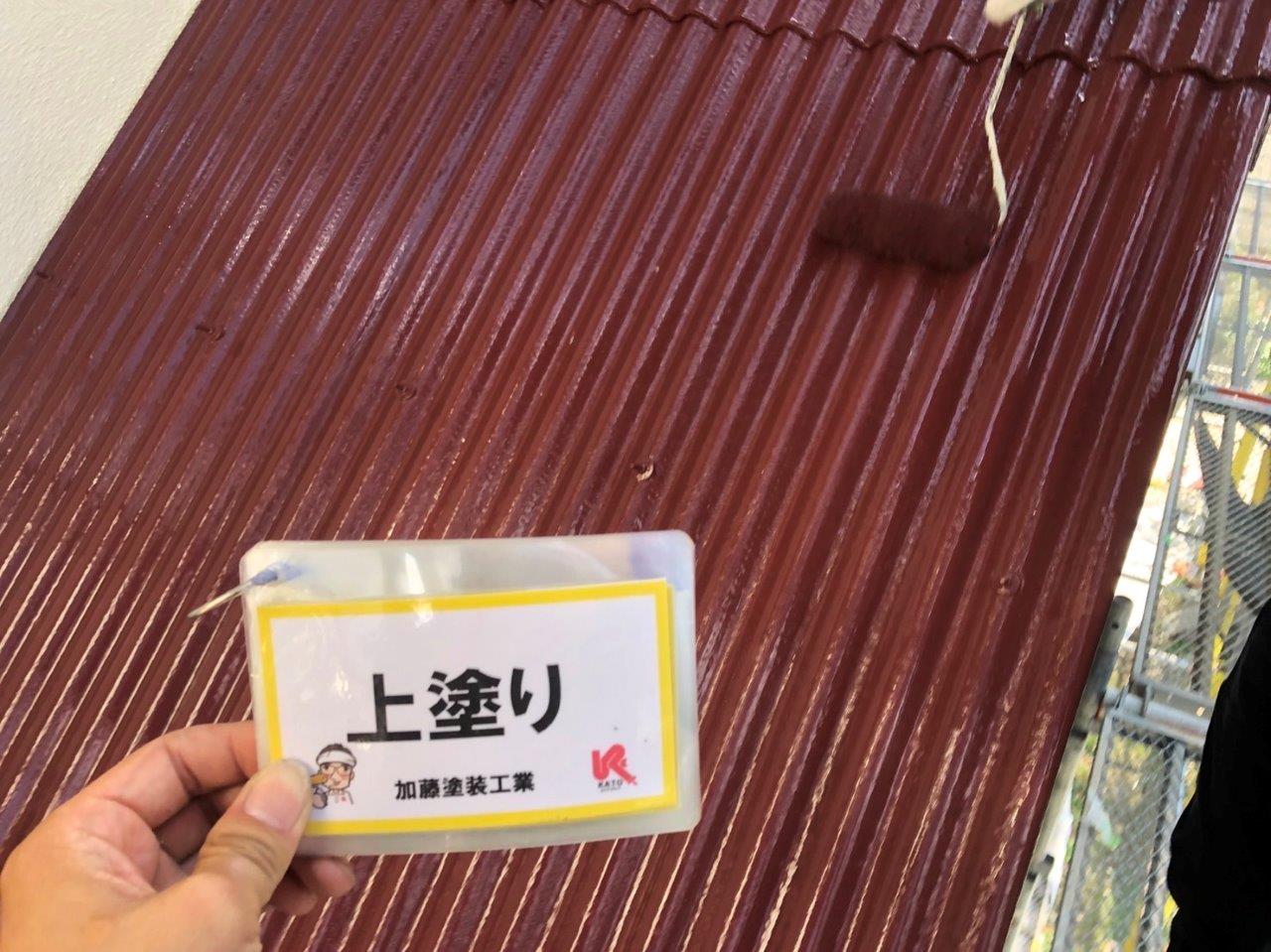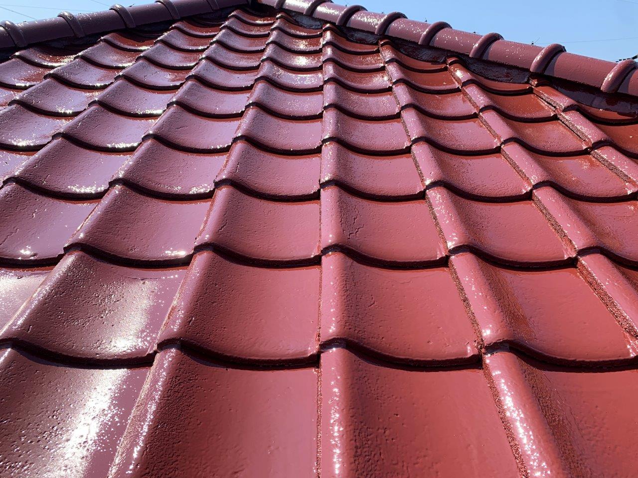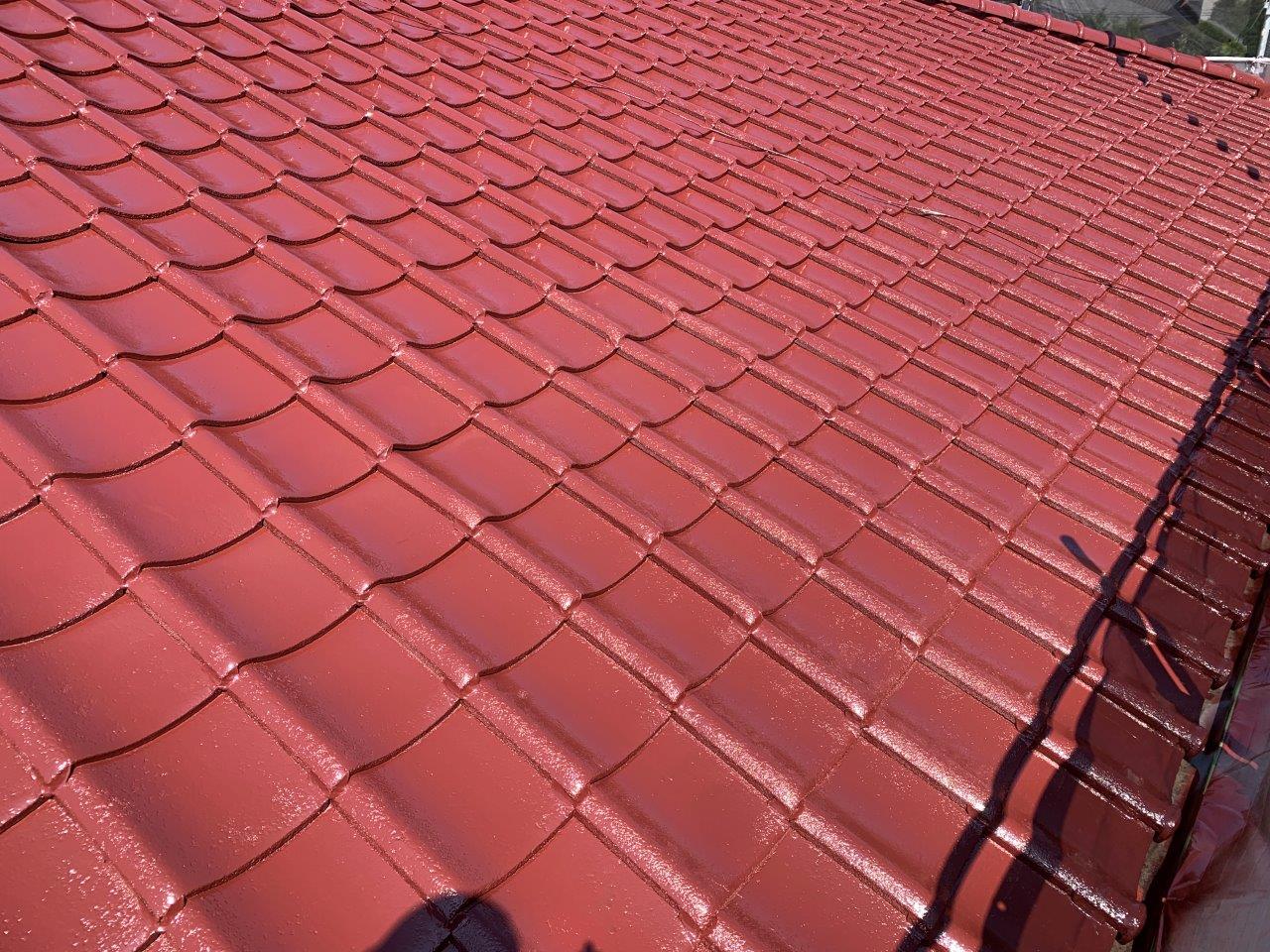 本日屋根の上塗りをおこないます。 その前に中塗りの状況を写真とりました。中塗りでこのように艶がでます。根幹である下塗りをちゃんとすることでこのようになります。