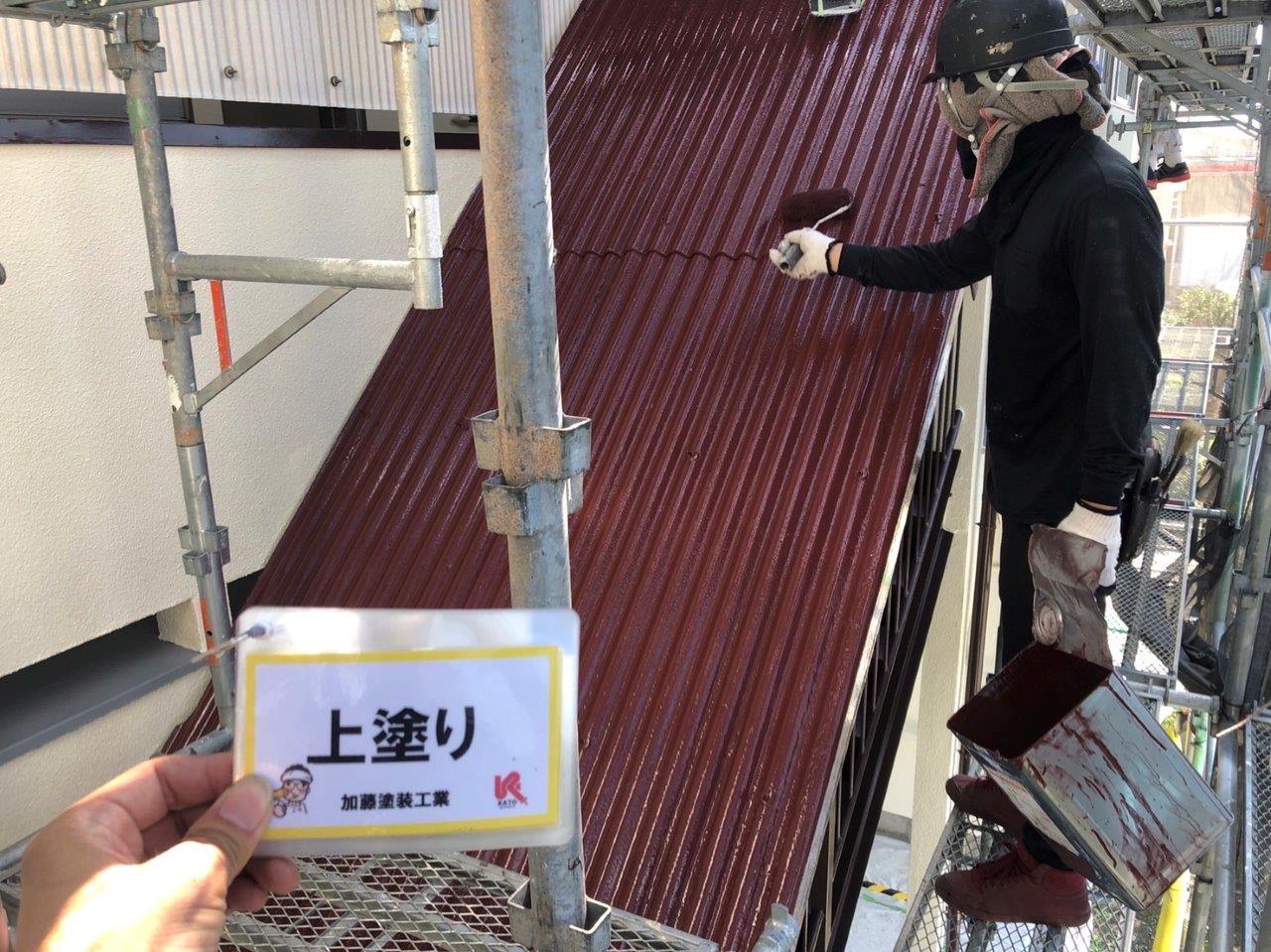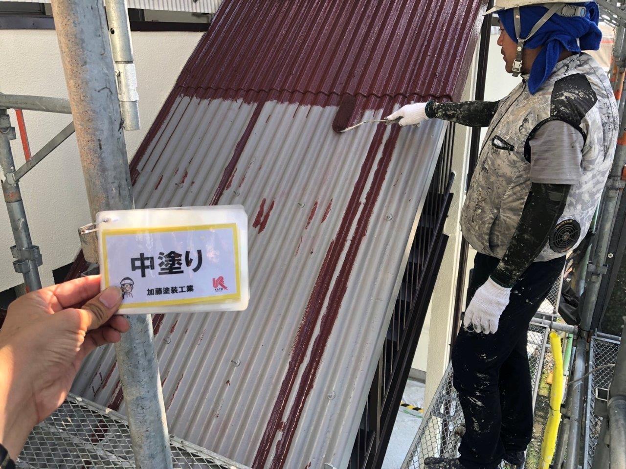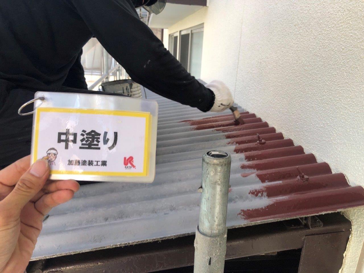 本日屋根の上塗りをおこないます。 その前に中塗りの状況を写真とりました。中塗りでこのように艶がでます。根幹である下塗りをちゃんとすることでこのようになります。