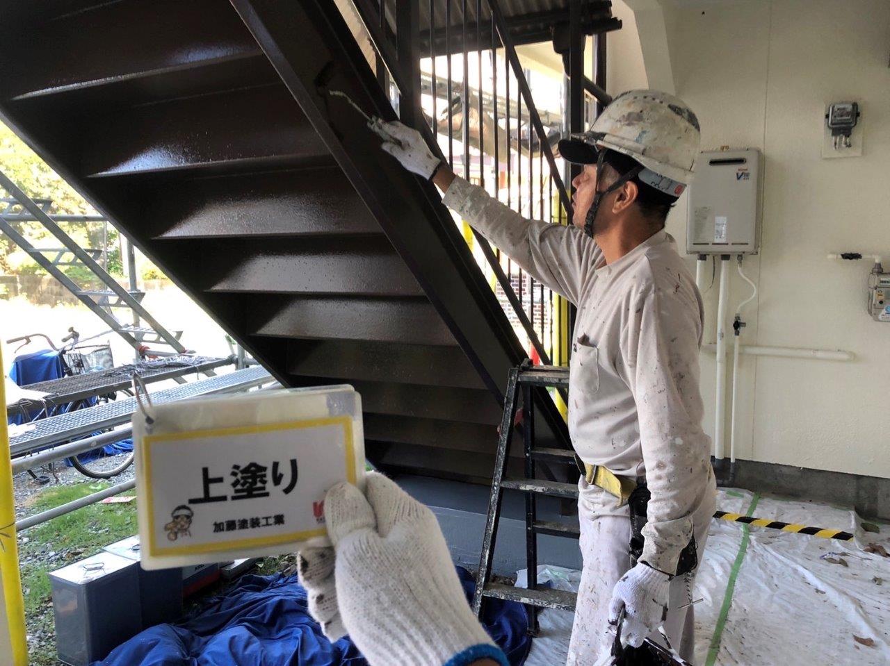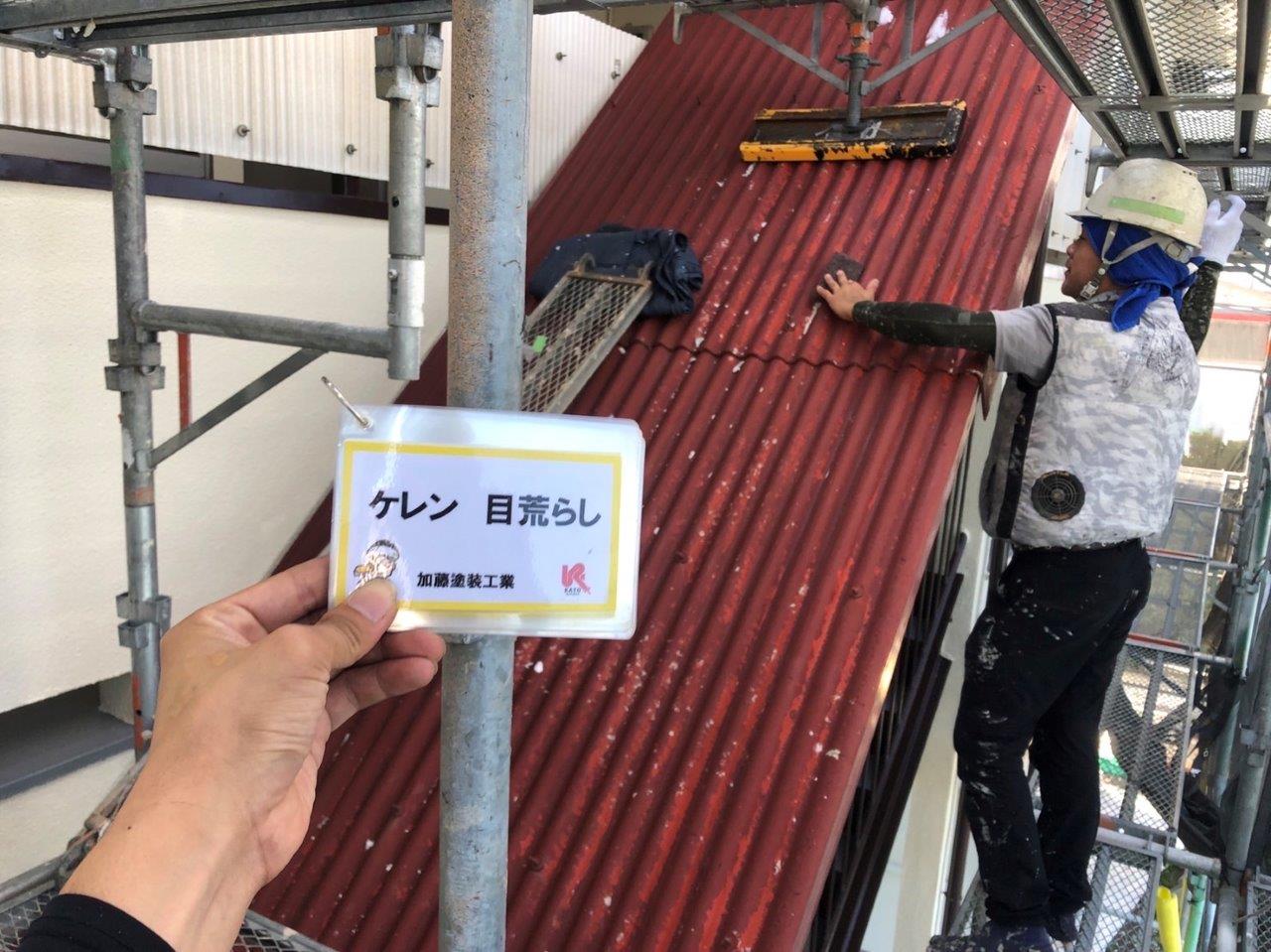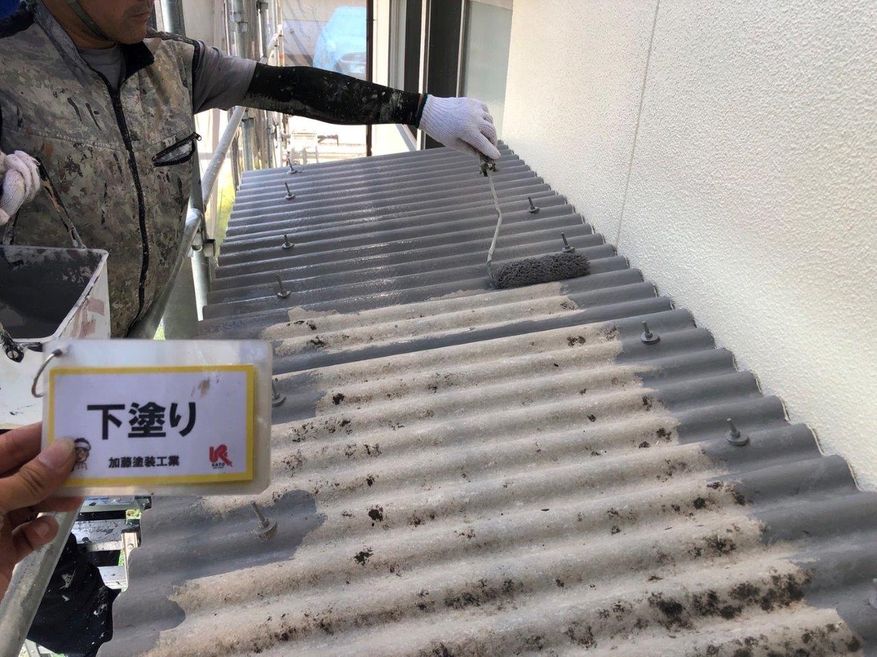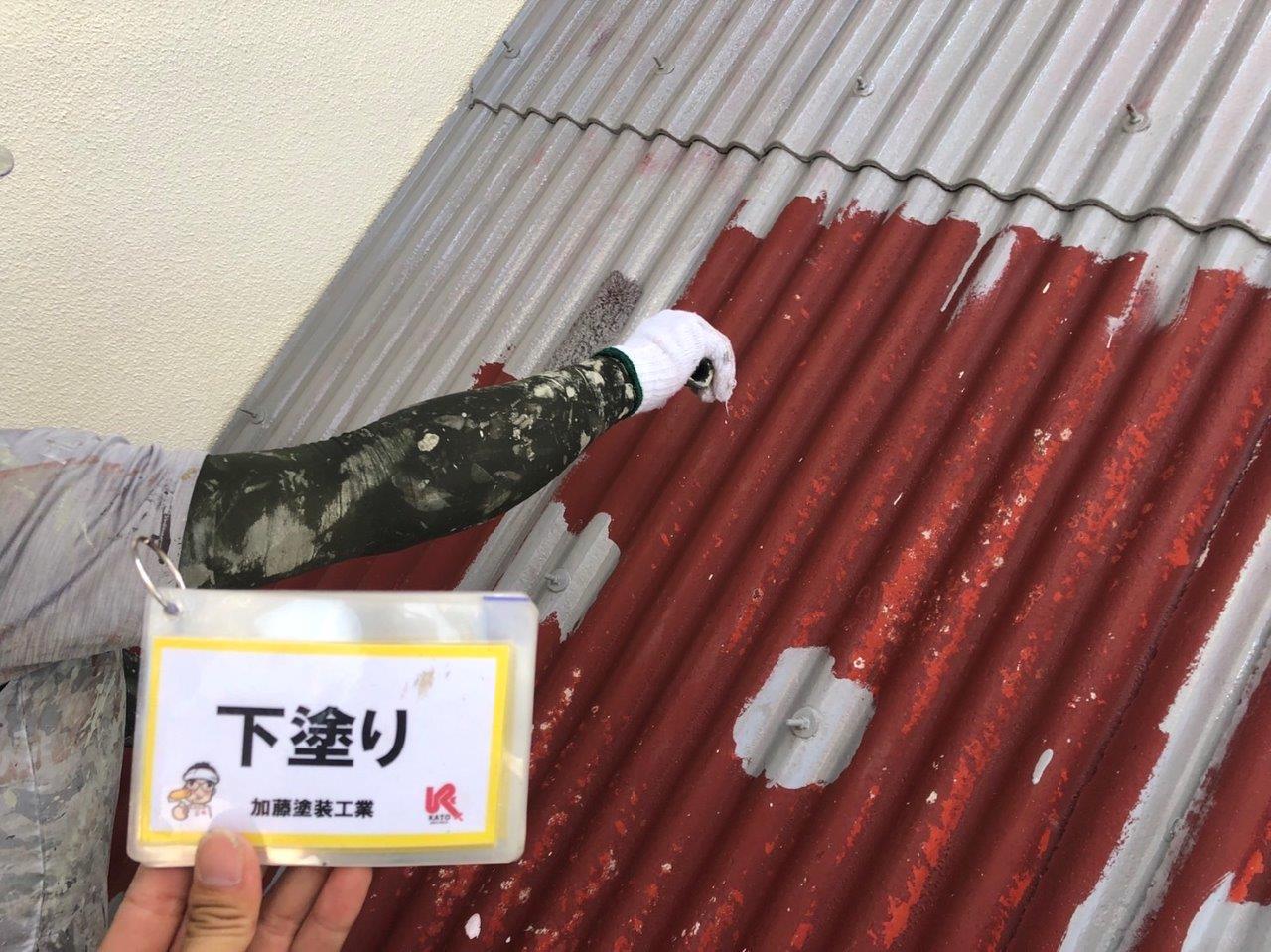 本日屋根の上塗りをおこないます。 その前に中塗りの状況を写真とりました。中塗りでこのように艶がでます。根幹である下塗りをちゃんとすることでこのようになります。