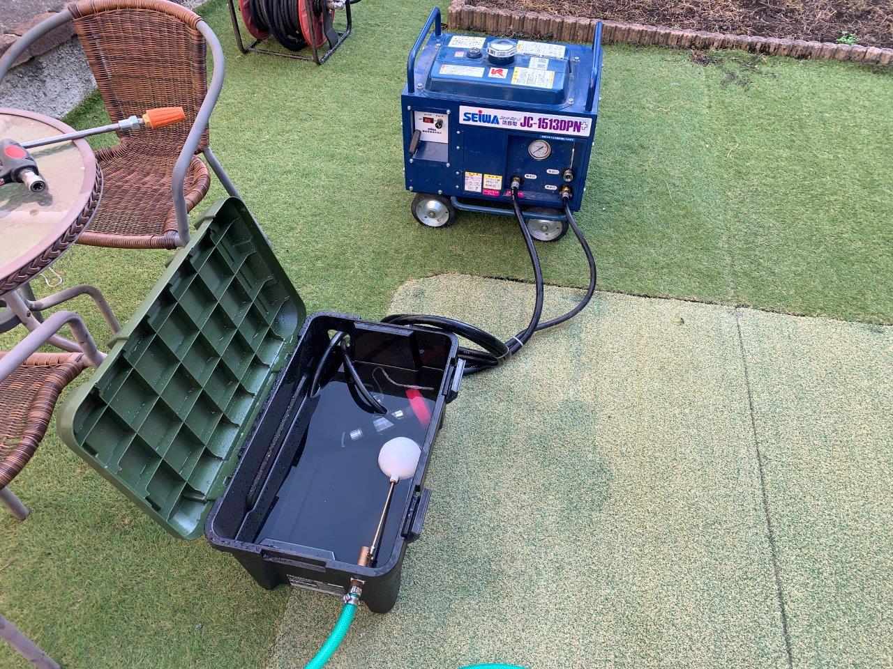 高圧洗浄状況をはじめていきます。節水ポンプも取りつけておりますので水が満タンになったら止まる仕組みとなっております。
