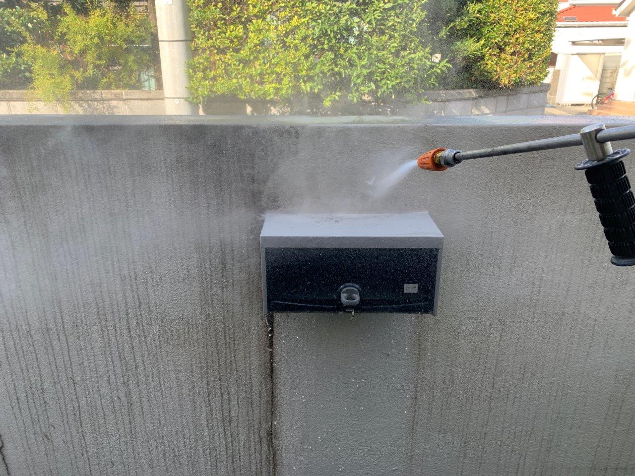塀の高圧洗浄状況です。雨すじ汚れがめにつきました。塀は超低汚染リファイン(強力防カビ材添加)で施工します。